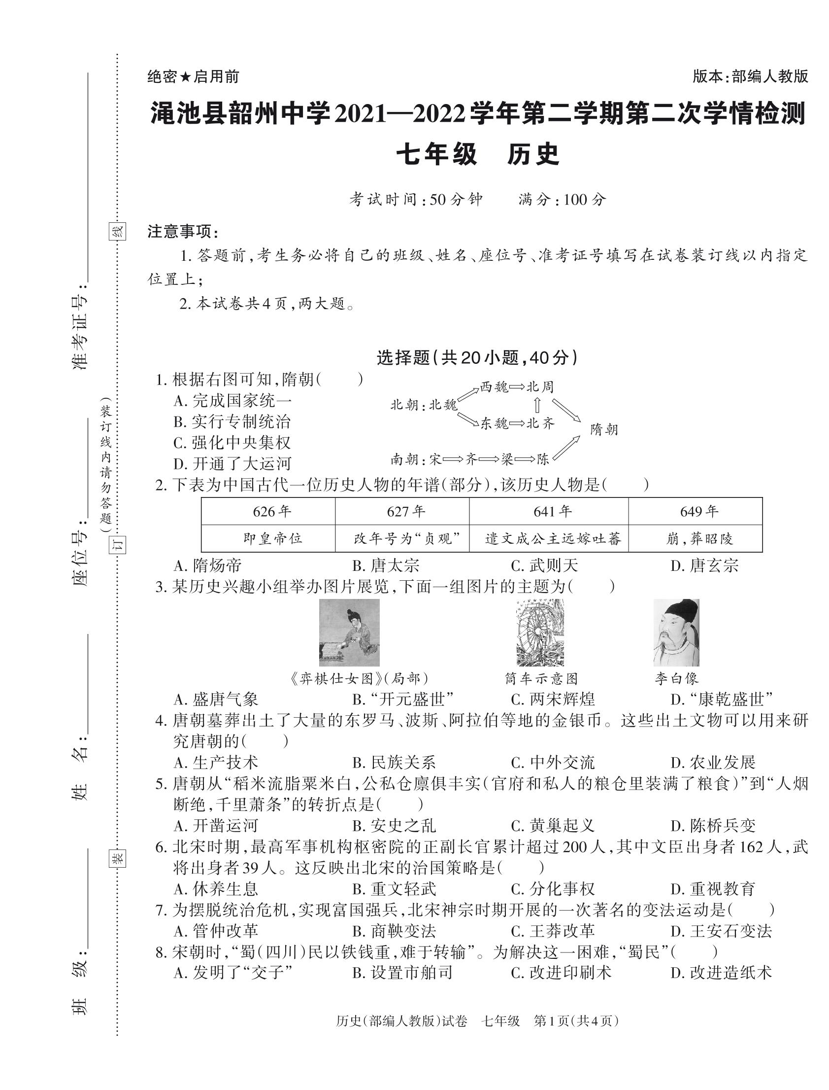 河南省三门峡市渑池县某中学2021-2022学年第二学期第二次学情检测七年级历史(人教版)