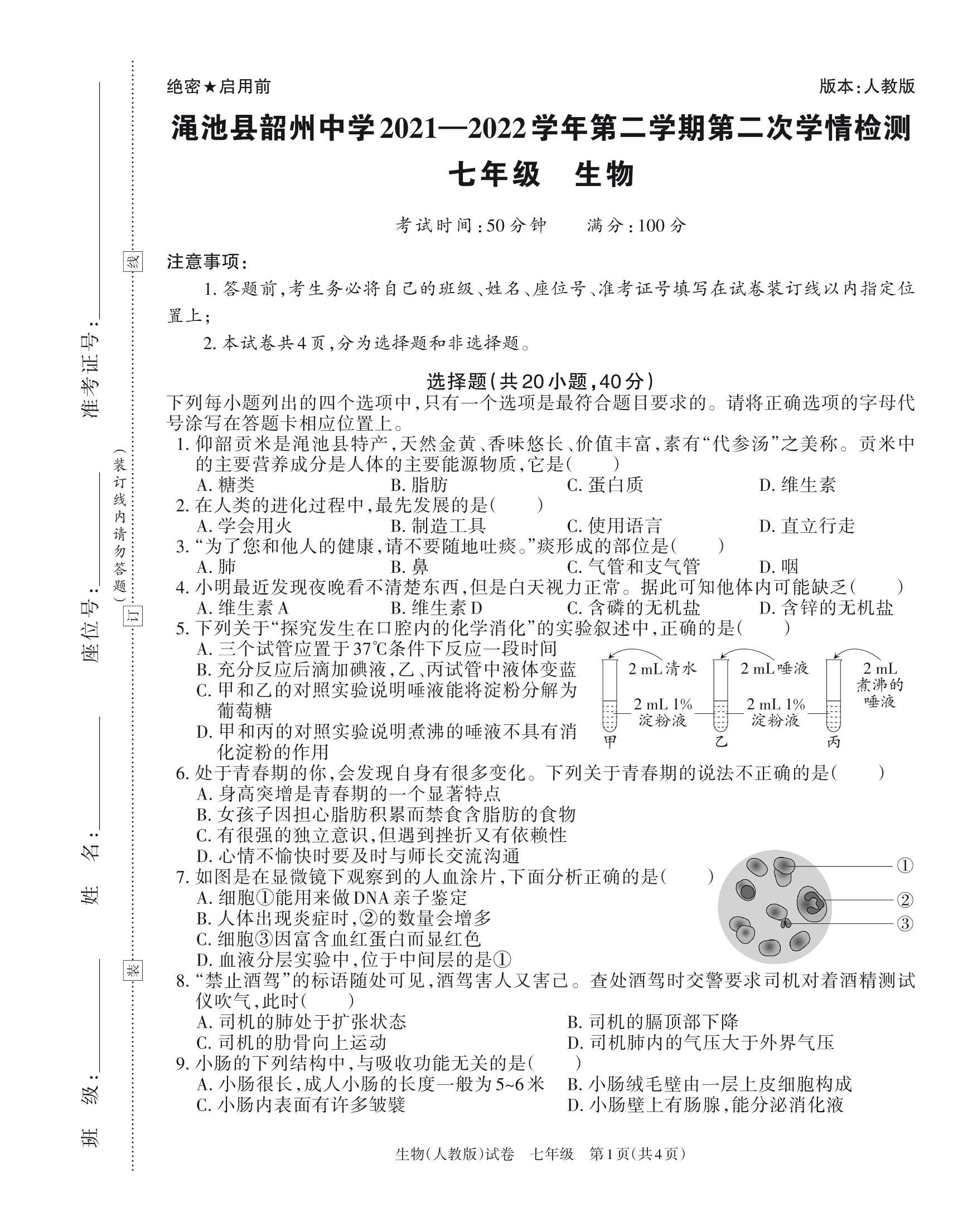 河南省三门峡市渑池县某中学2021-2022学年第二学期第二次学情检测七年级生物(人教版)