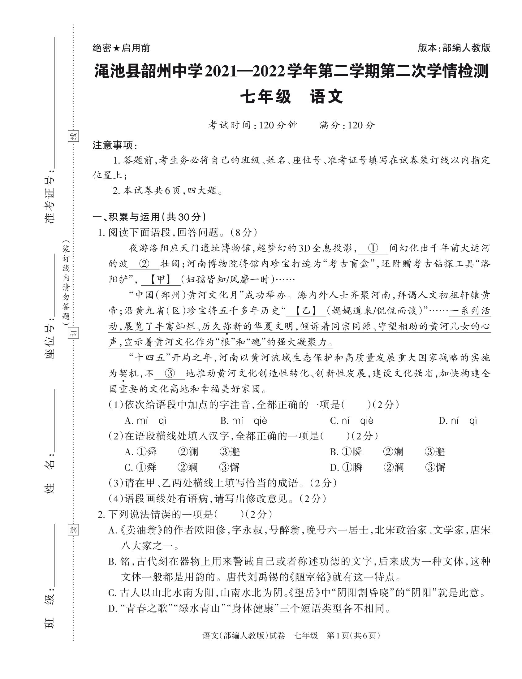河南省三门峡市渑池县某中学2021-2022学年第二学期第二次学情检测七年级语文(人教版)