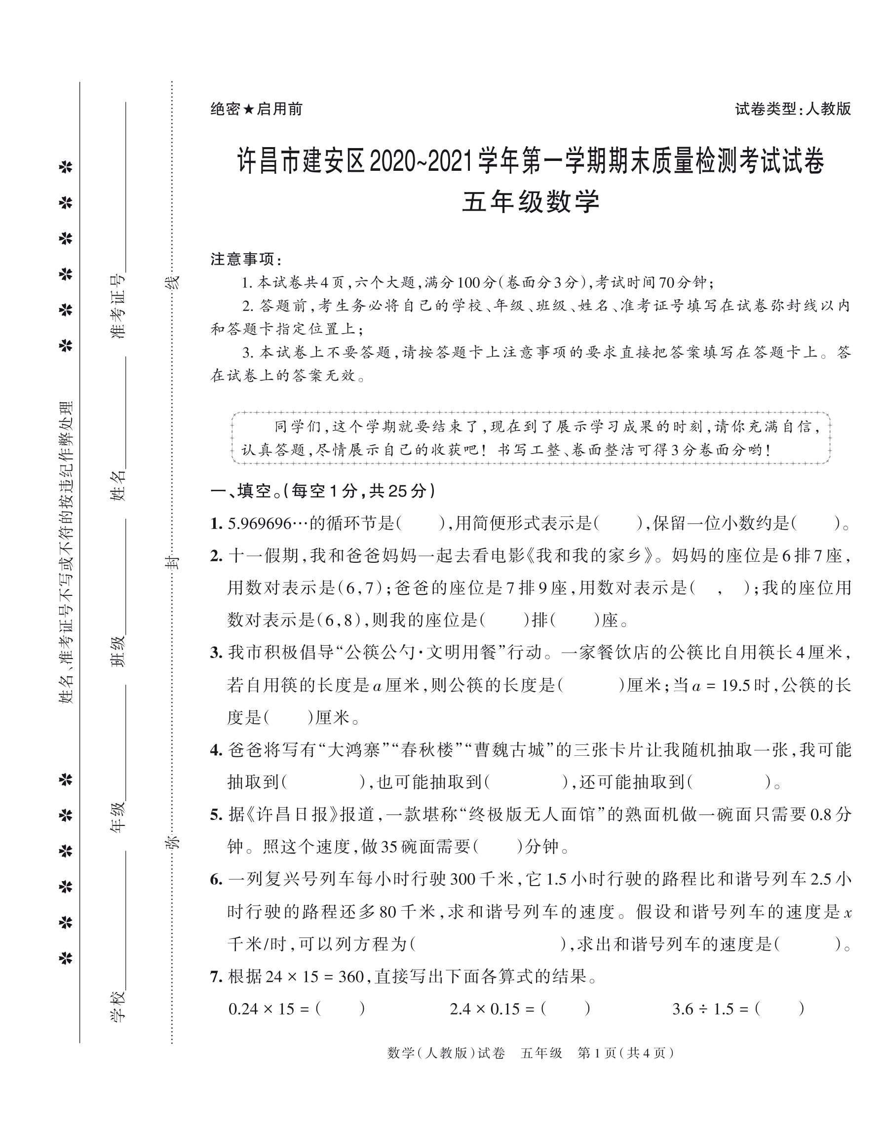河南省许昌市建安区2020-2021学年第一学期期末质量检测考试试卷五年级数学(人教版)