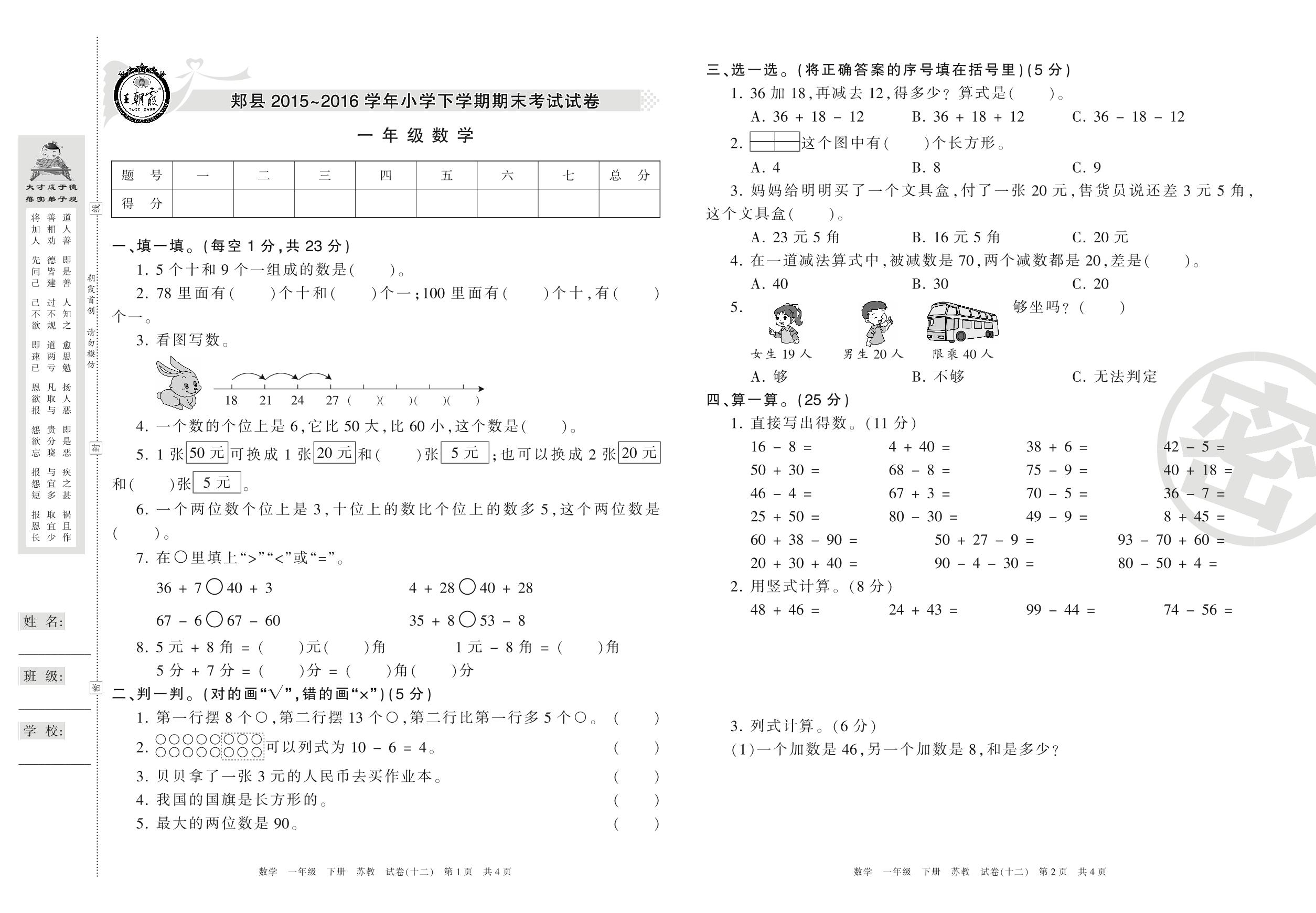 一年级数学苏教版下册期末卷