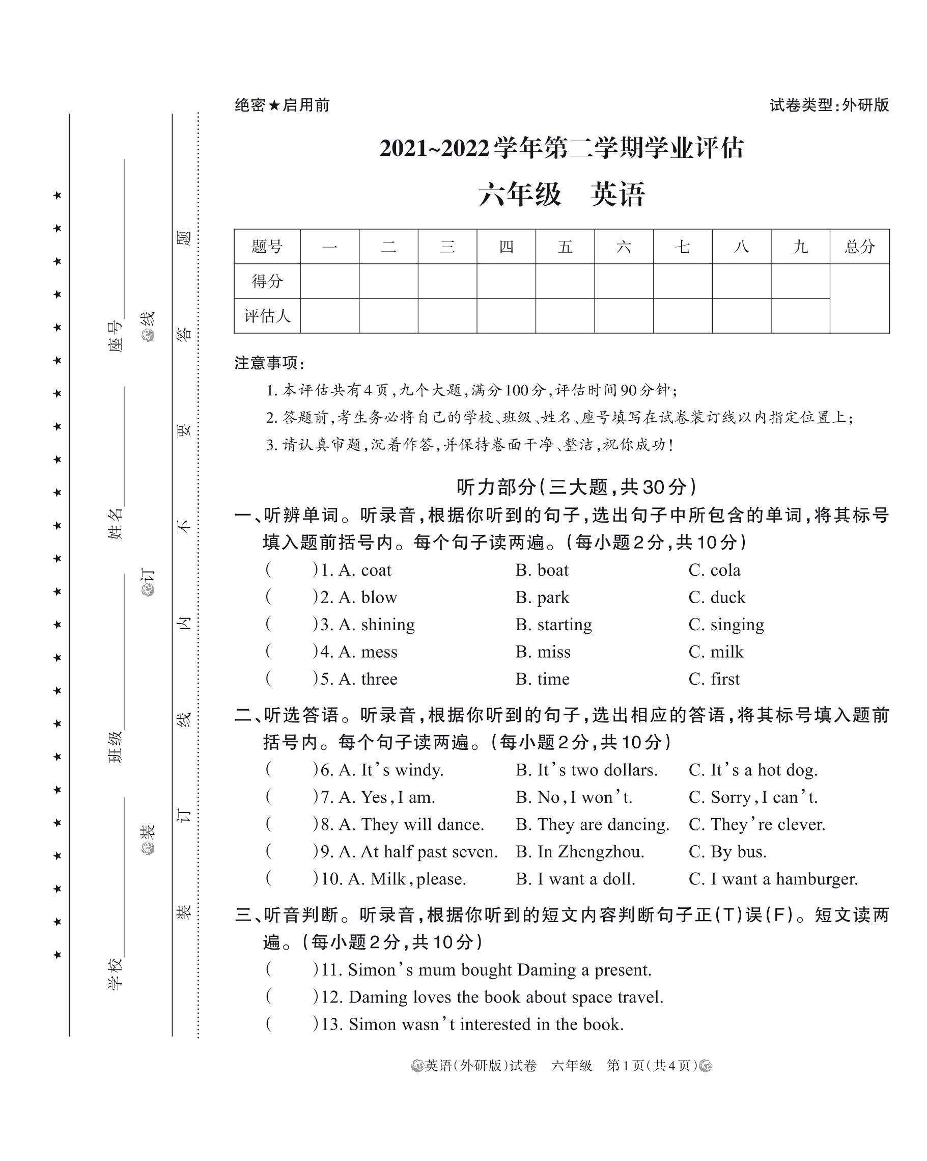六年级英语外研版(三起始)下册期末卷
