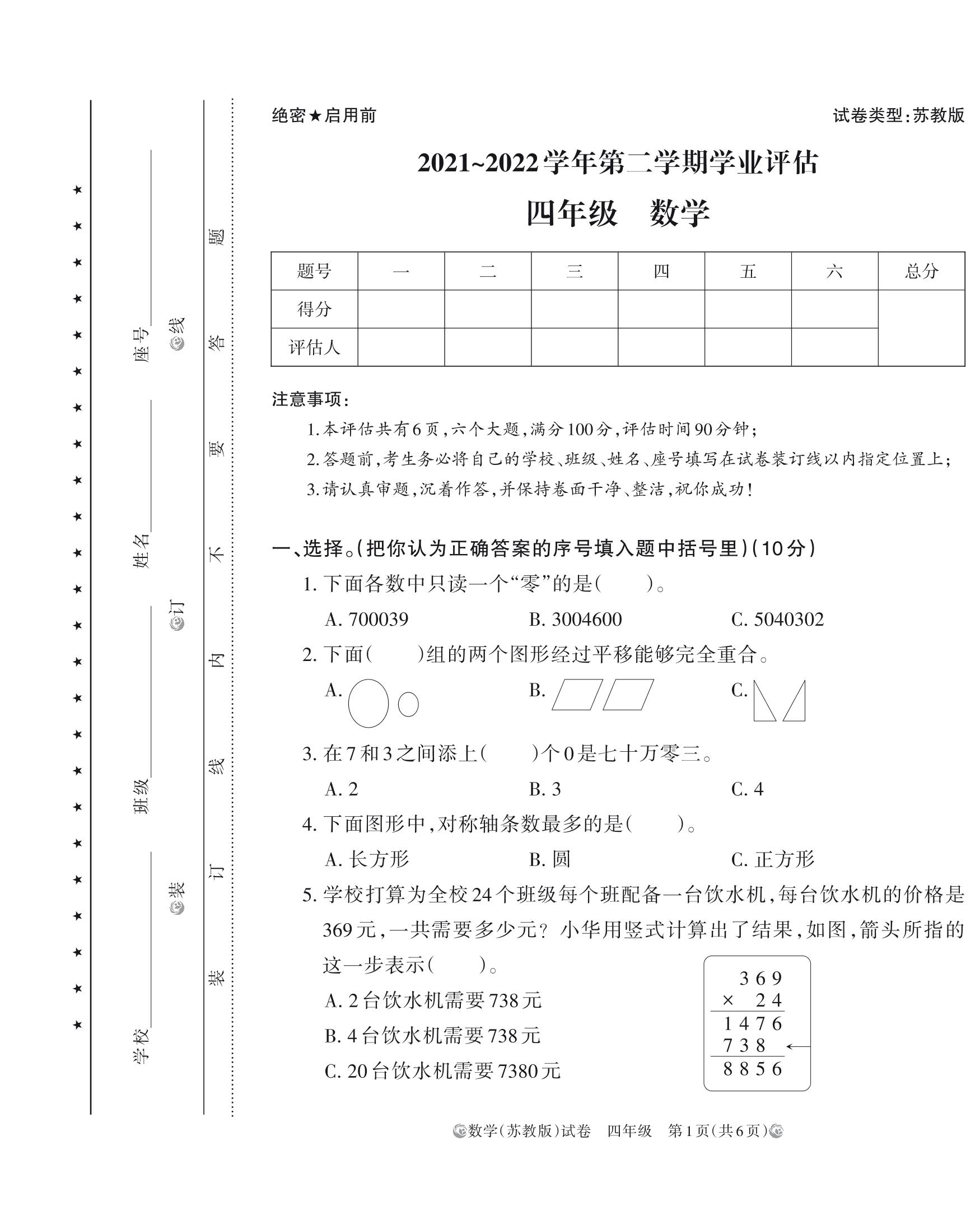 河南省洛阳市嵩县2021-2022学年第二学期学业评估四年级数学(苏教版)