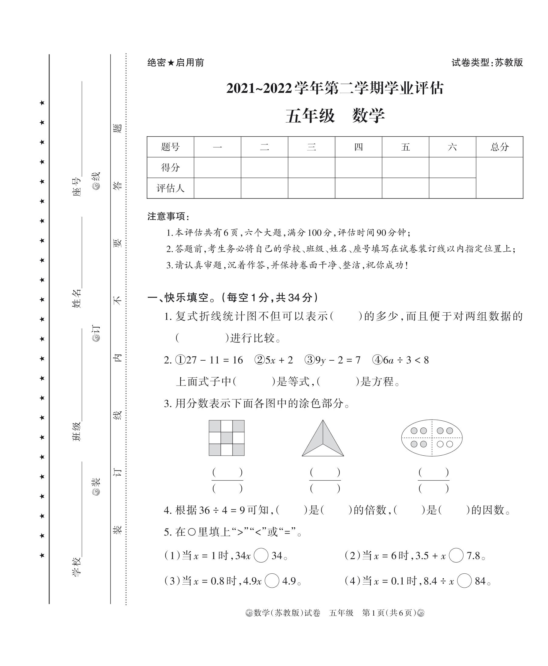 河南省洛阳市嵩县2021-2022学年第二学期学业评估五年级数学(苏教版)