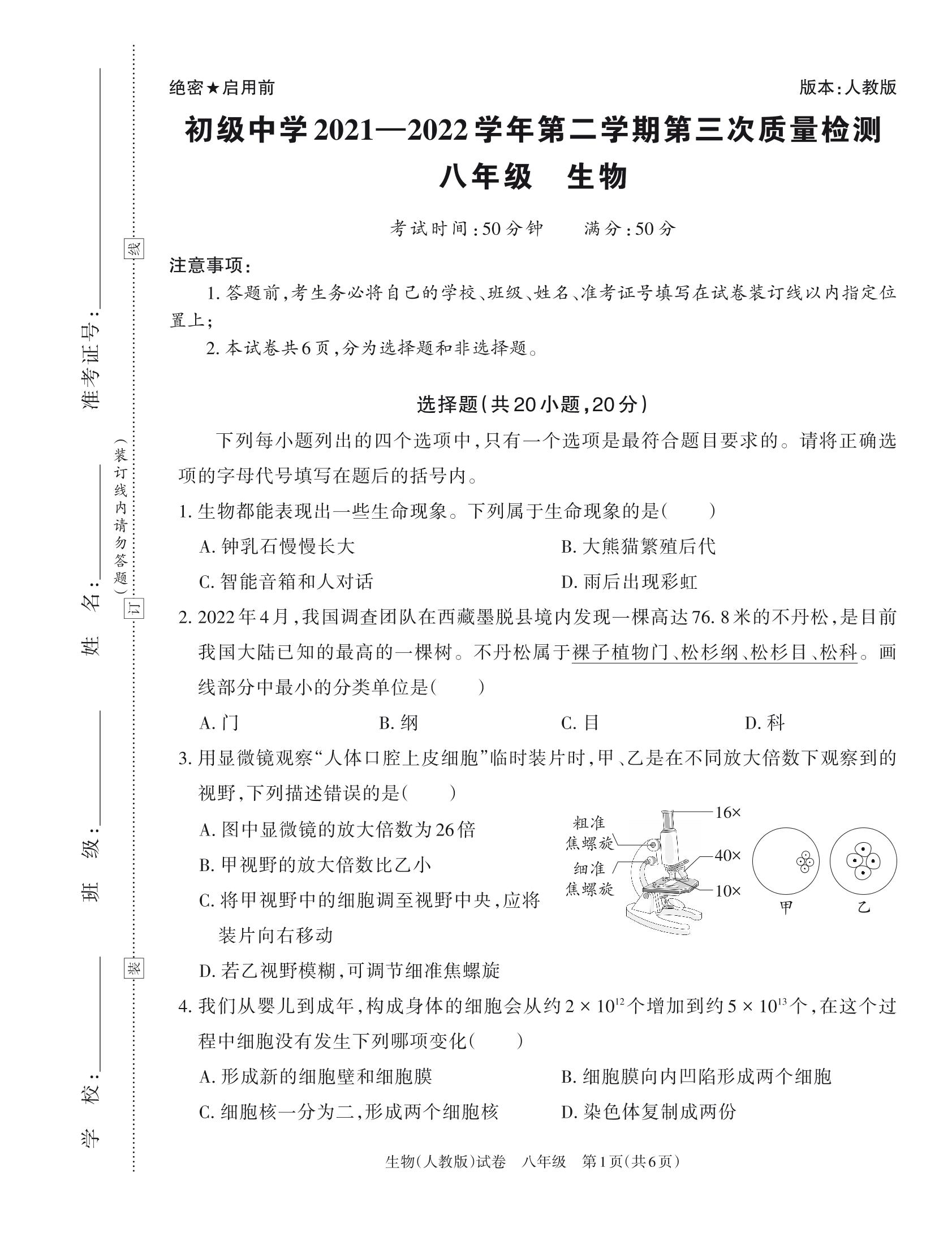 河南省南阳市某中学2021-2022学年第二学期第三次质量检测八年级生物(人教版)