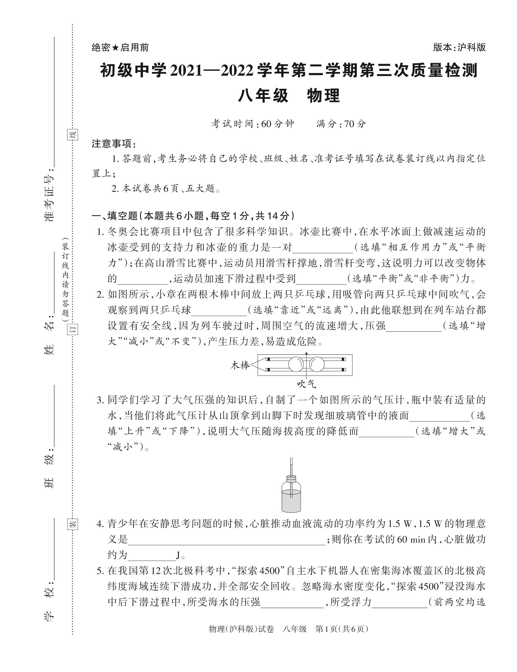 河南省南阳市某中学2021-2022学年第二学期第三次质量检测八年级物理(沪科版)