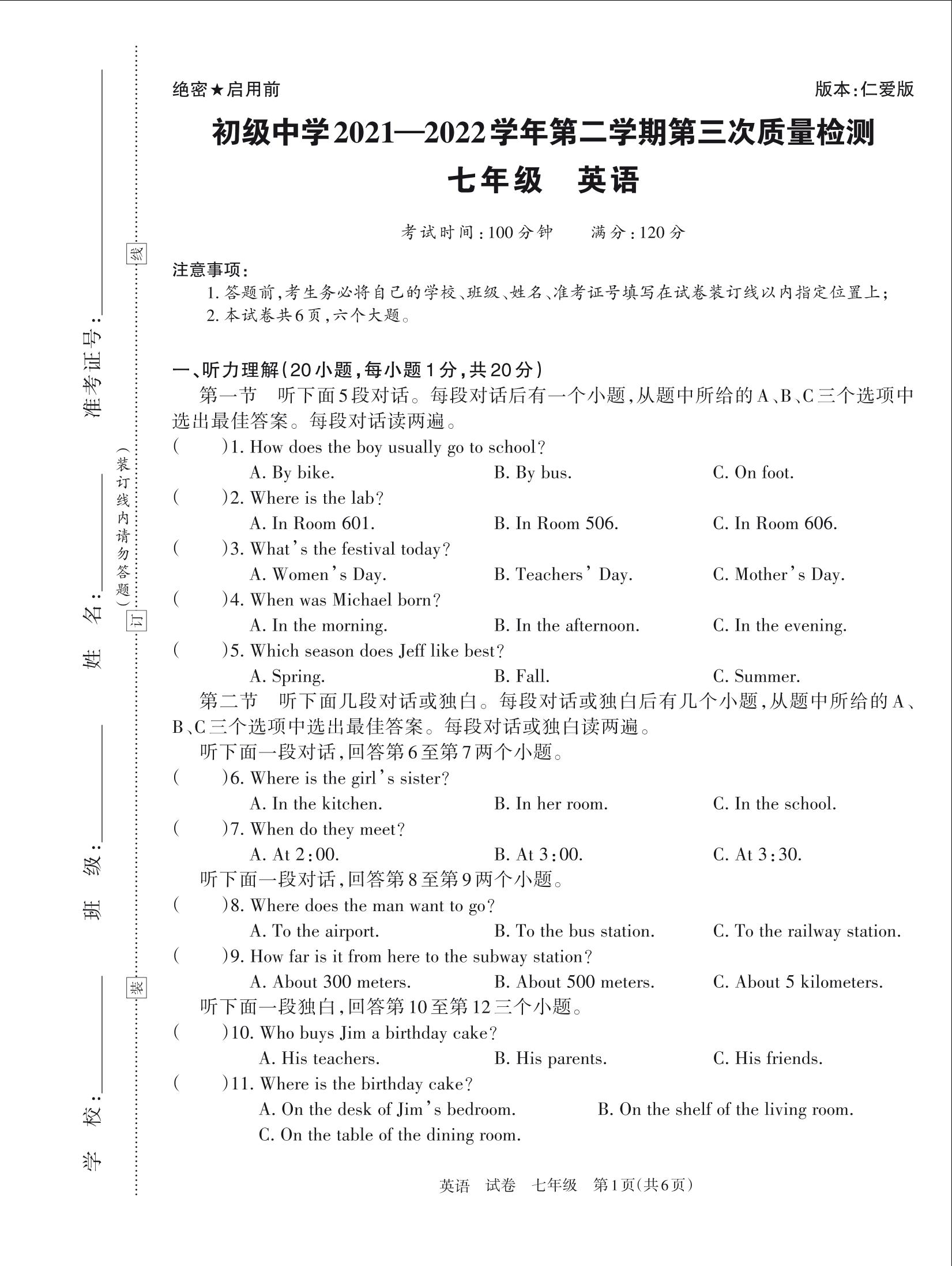 河南省南阳市某中学2021-2022学年第二学期第三次质量检测七年级英语(新课标版)