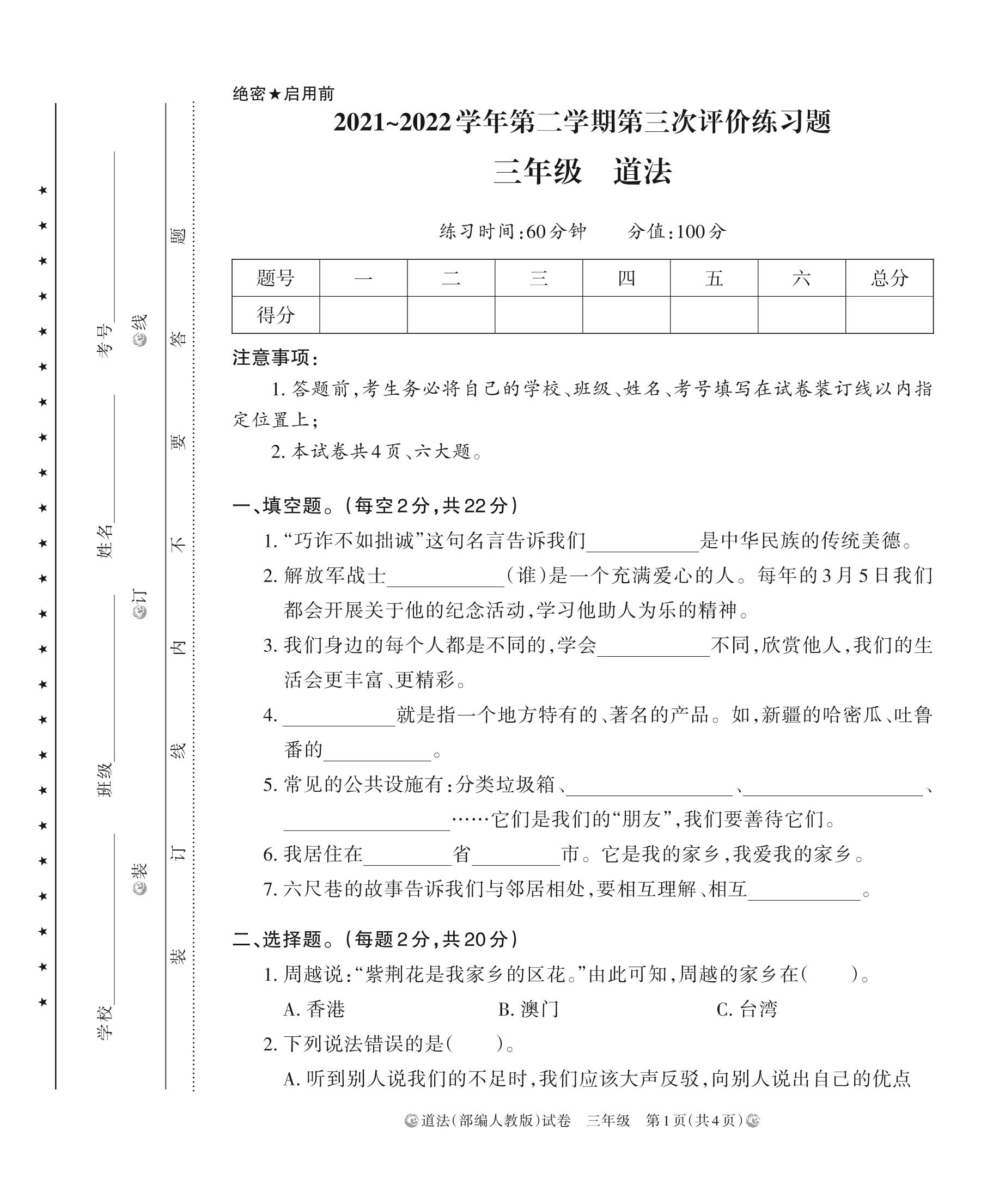 河南省南阳市邓州市某小学2021-2022学年第二学期第三次评价练习题三年级道德与法治(人教版)