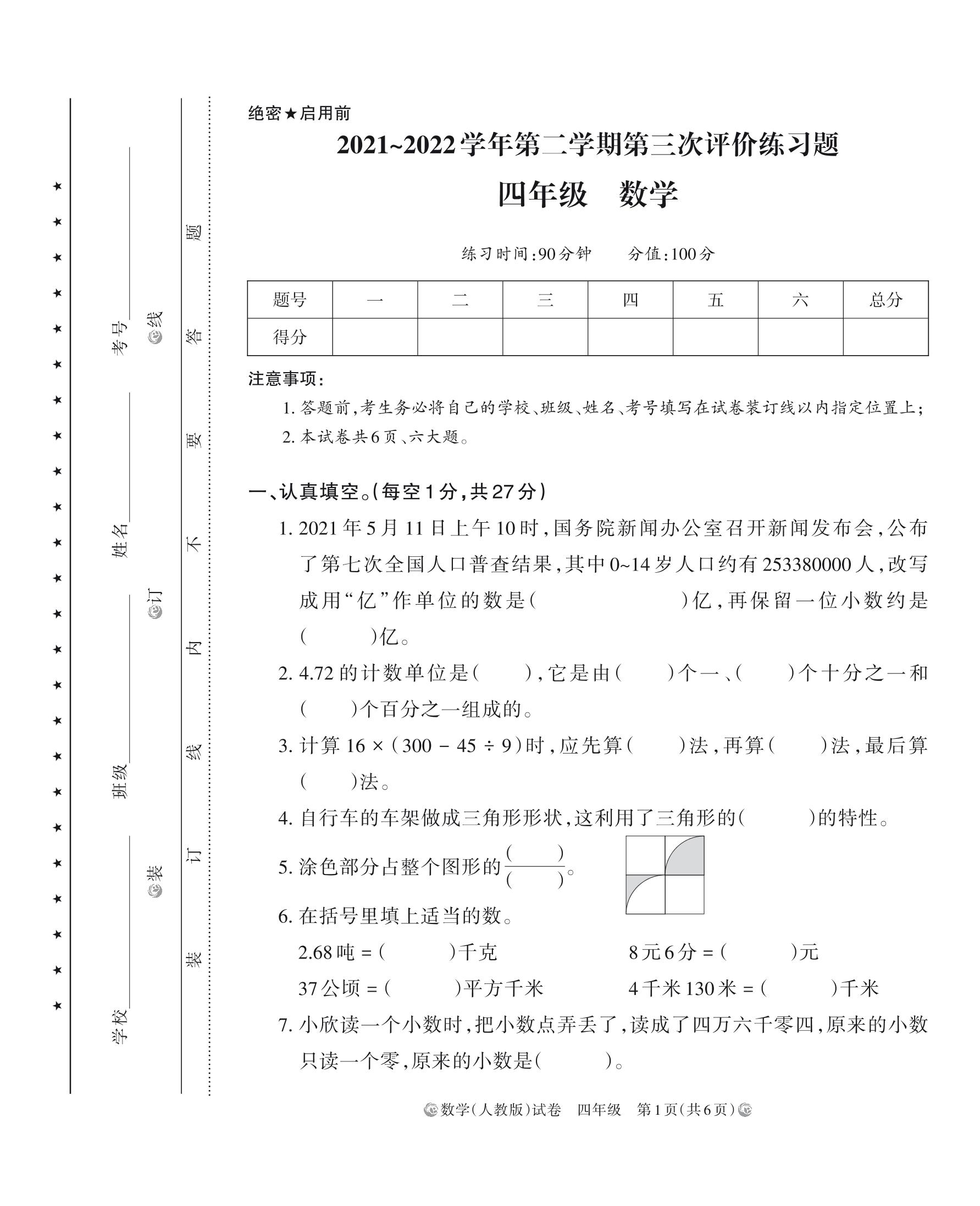 河南省南阳市邓州市某小学2021-2022学年第二学期第三次评价练习题四年级数学(人教版)