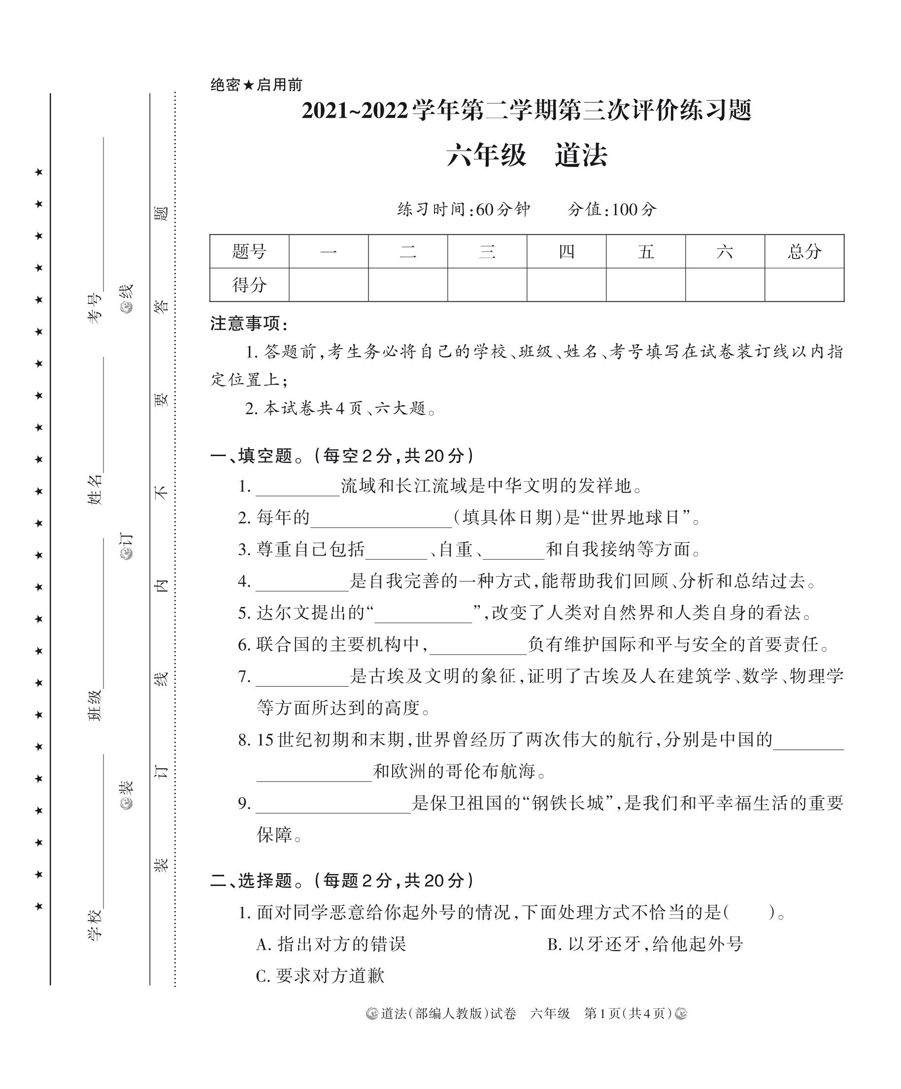 河南省南阳市邓州市某小学2021-2022学年第二学期第三次评价练习题六年级道德与法治(人教版)