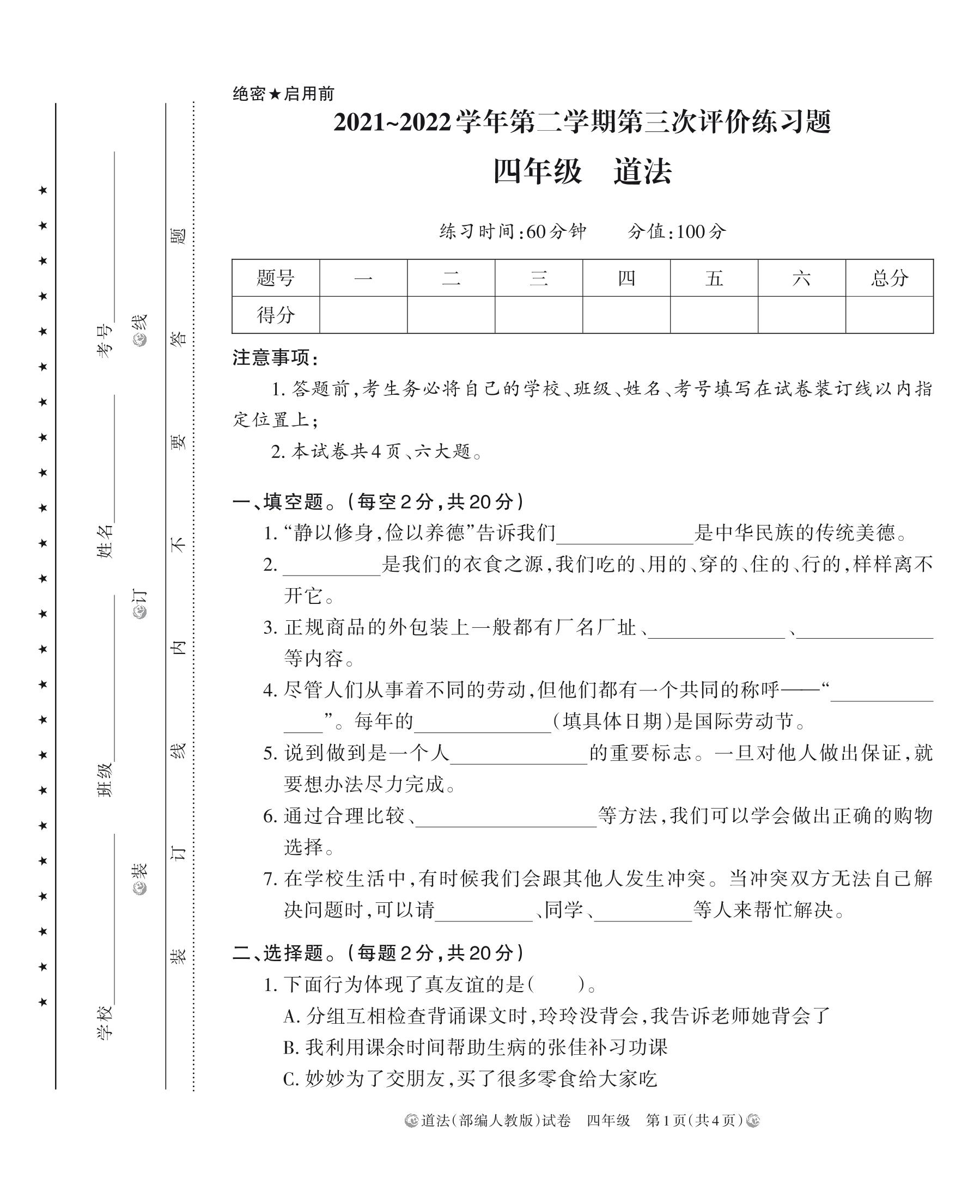 河南省南阳市邓州市某小学2021-2022学年第二学期第三次评价练习题四年级道德与法治(人教版)