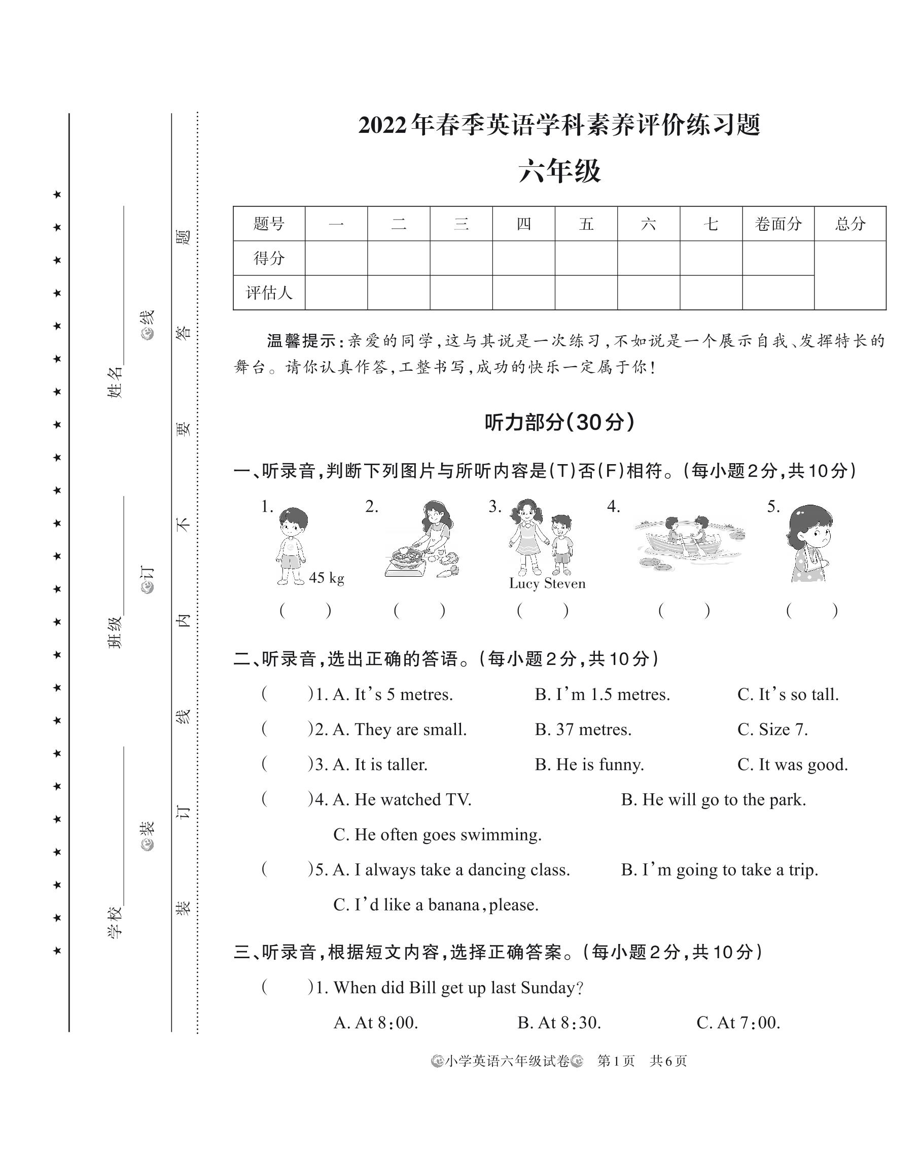 河南省郑州市中牟县某小学2021-2022学年第二学期学科素养评价练习题六年级英语(PEP版)