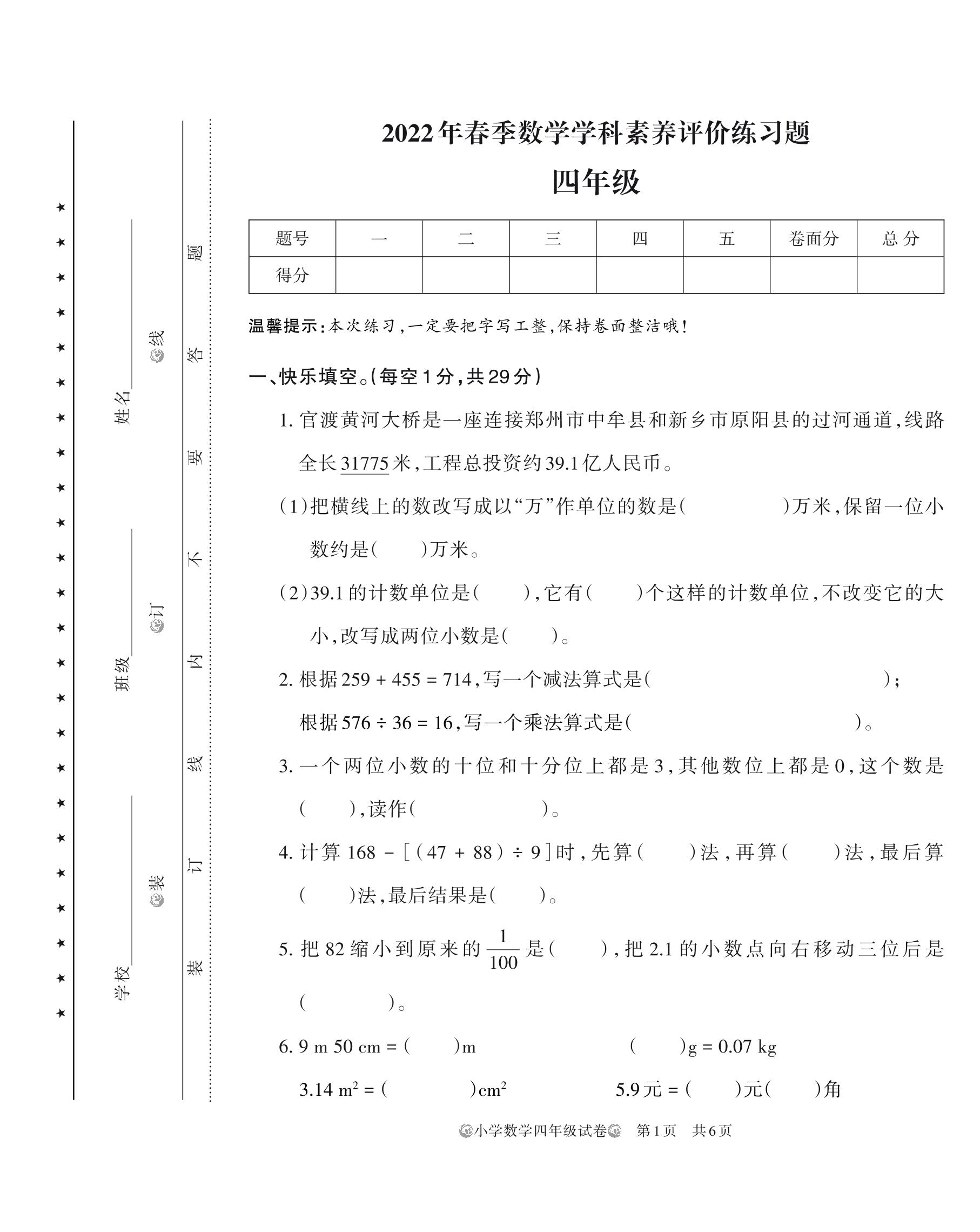 河南省郑州市中牟县某小学2021-2022学年第二学期学科素养评价练习题四年级数学(人教版)