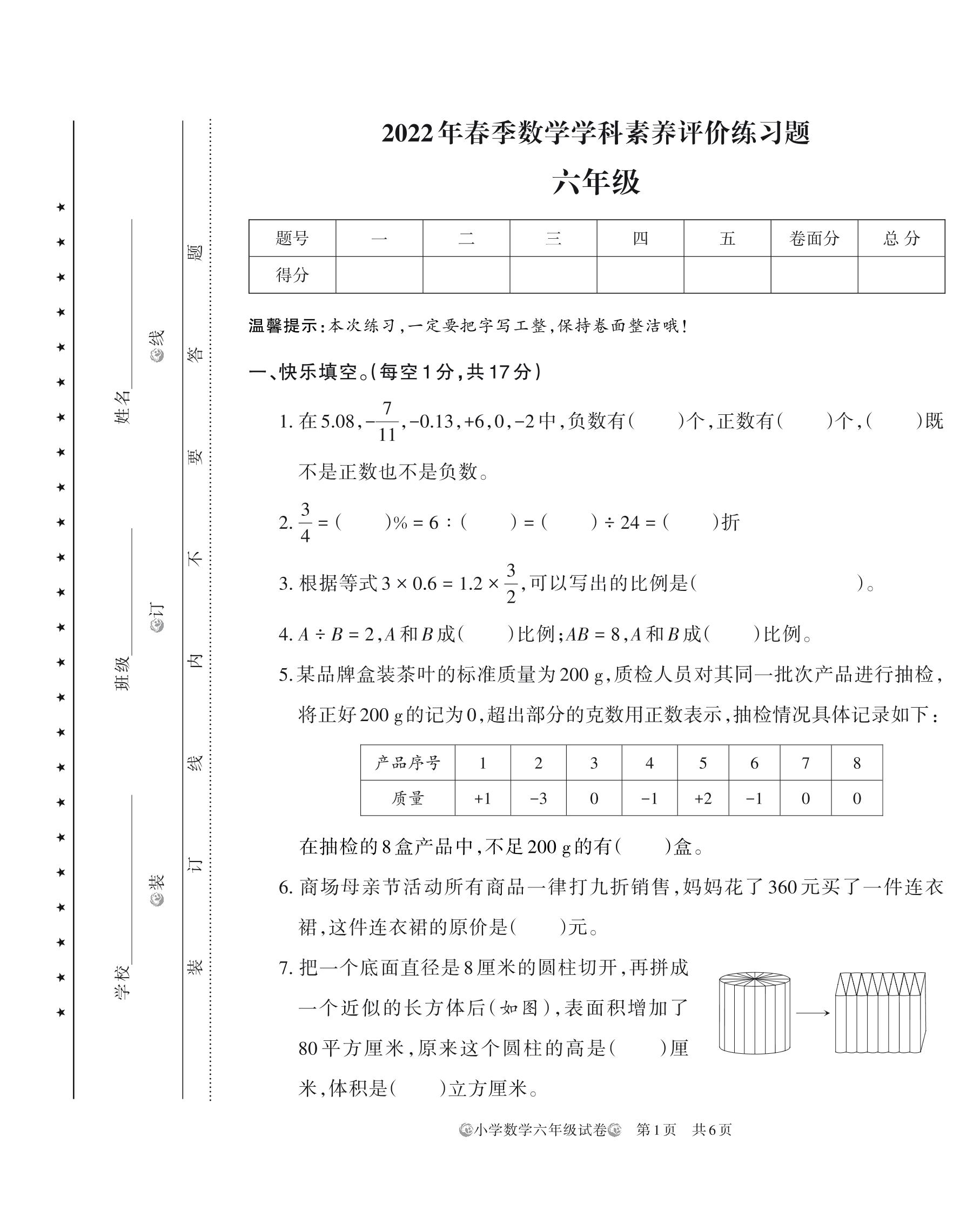 河南省郑州市中牟县某小学2021-2022学年第二学期学科素养评价练习题六年级数学(人教版)