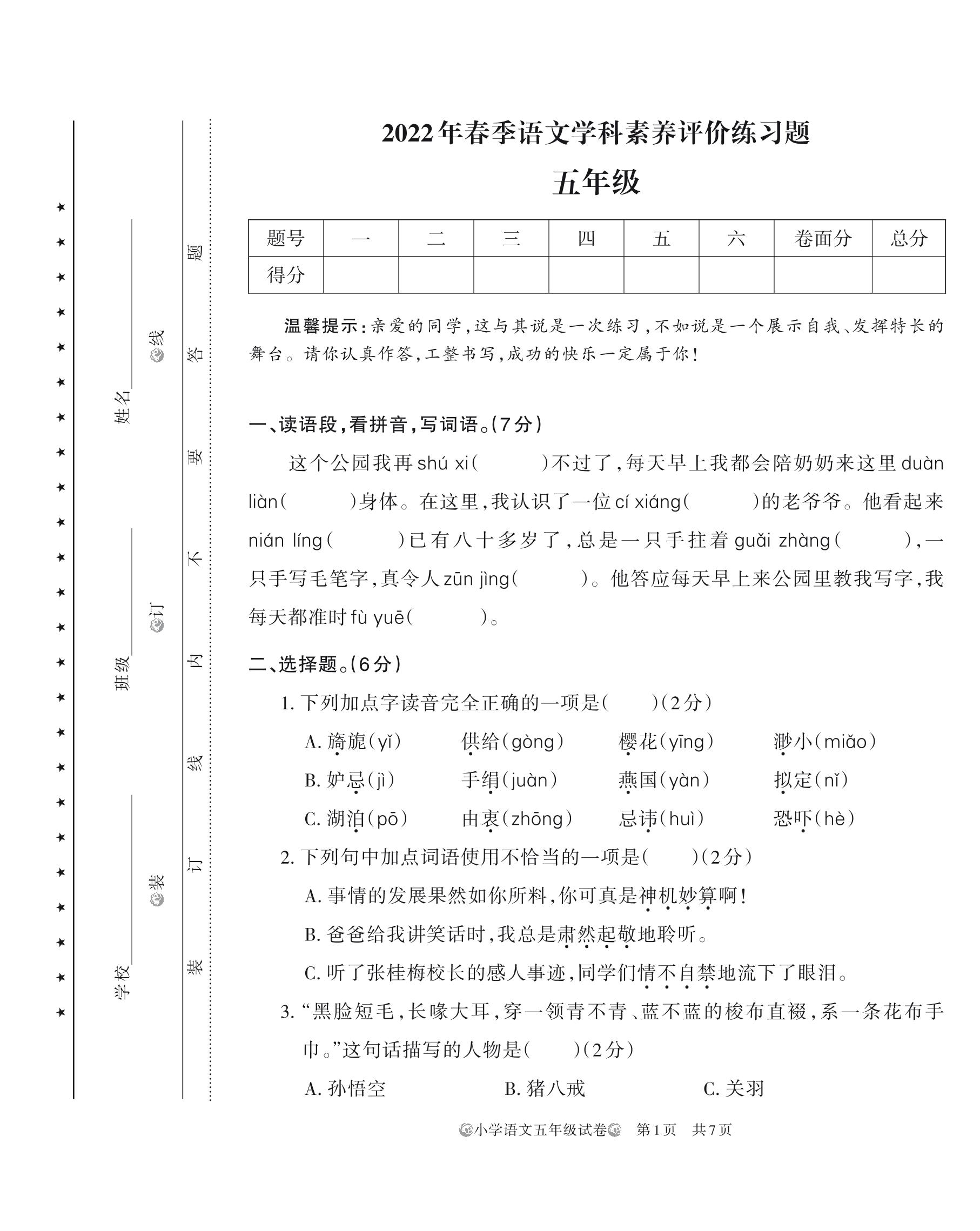 河南省郑州市中牟县某小学2021-2022学年第二学期学科素养评价练习题五年级语文(人教版)