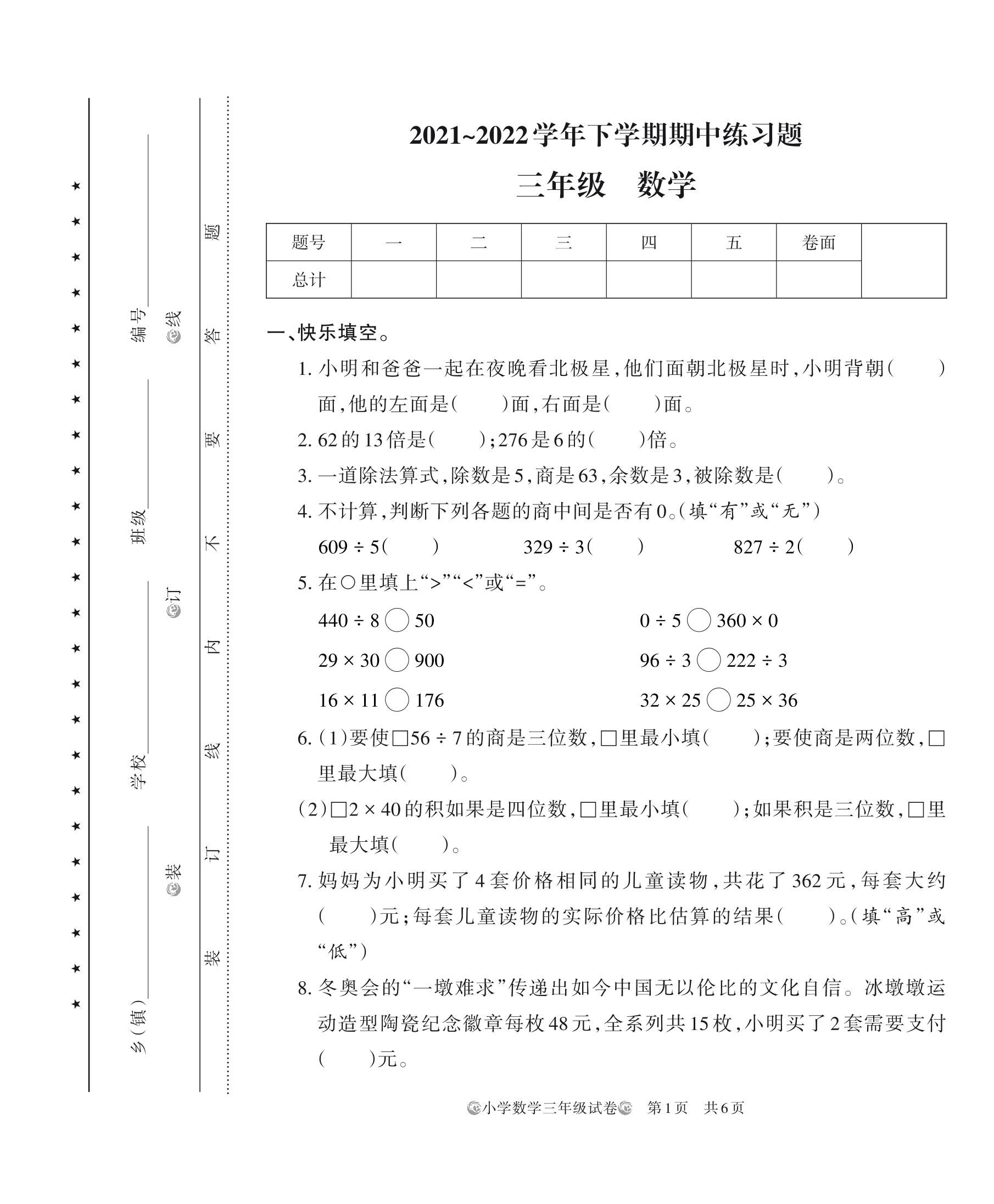河南省郑州市中牟县姚家镇2021-2022学年下学期期中练习题三年级数学(人教版)
