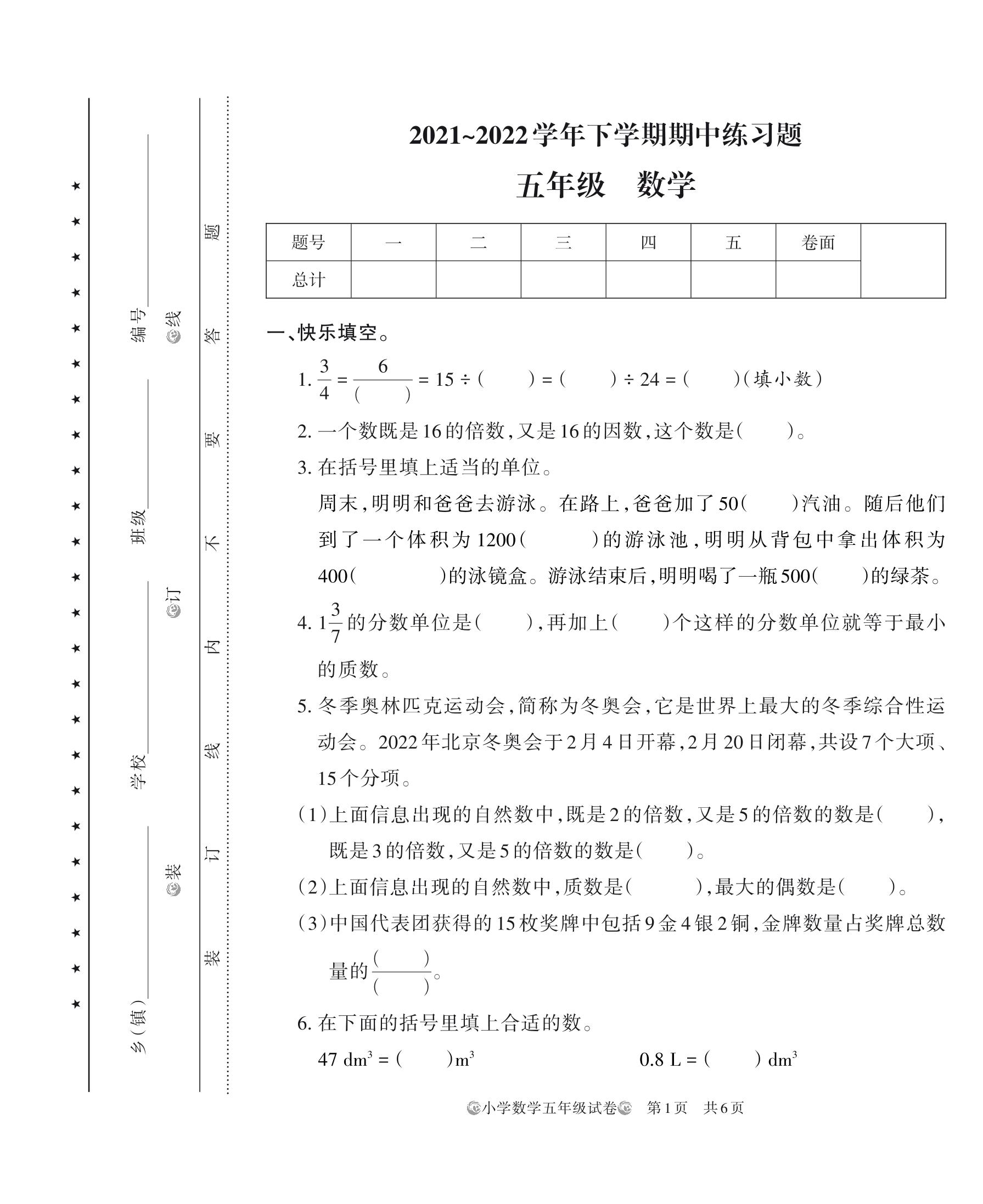 河南省郑州市中牟县姚家镇2021-2022学年下学期期中练习题五年级数学(人教版)