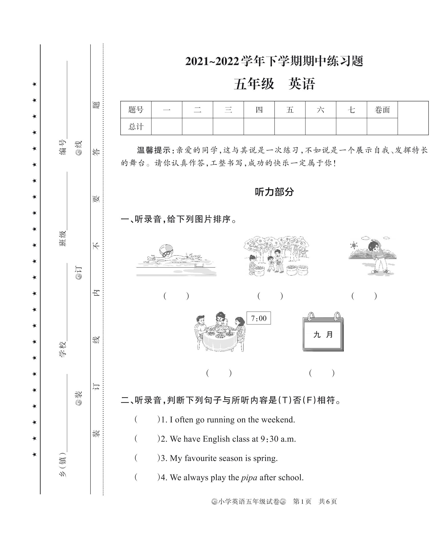 河南省郑州市中牟县姚家镇2021-2022学年下学期期中练习题五年级英语(PEP版)