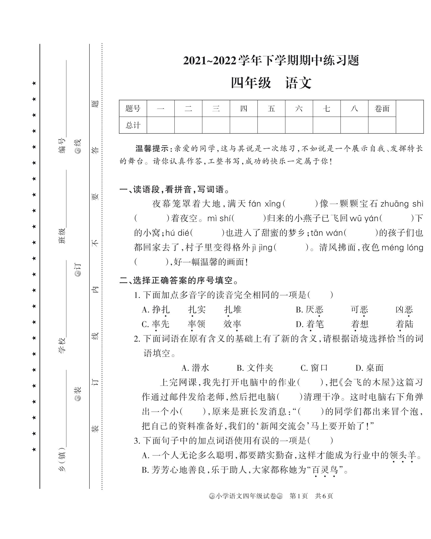 河南省郑州市中牟县姚家镇2021-2022学年下学期期中练习题四年级语文(人教版)