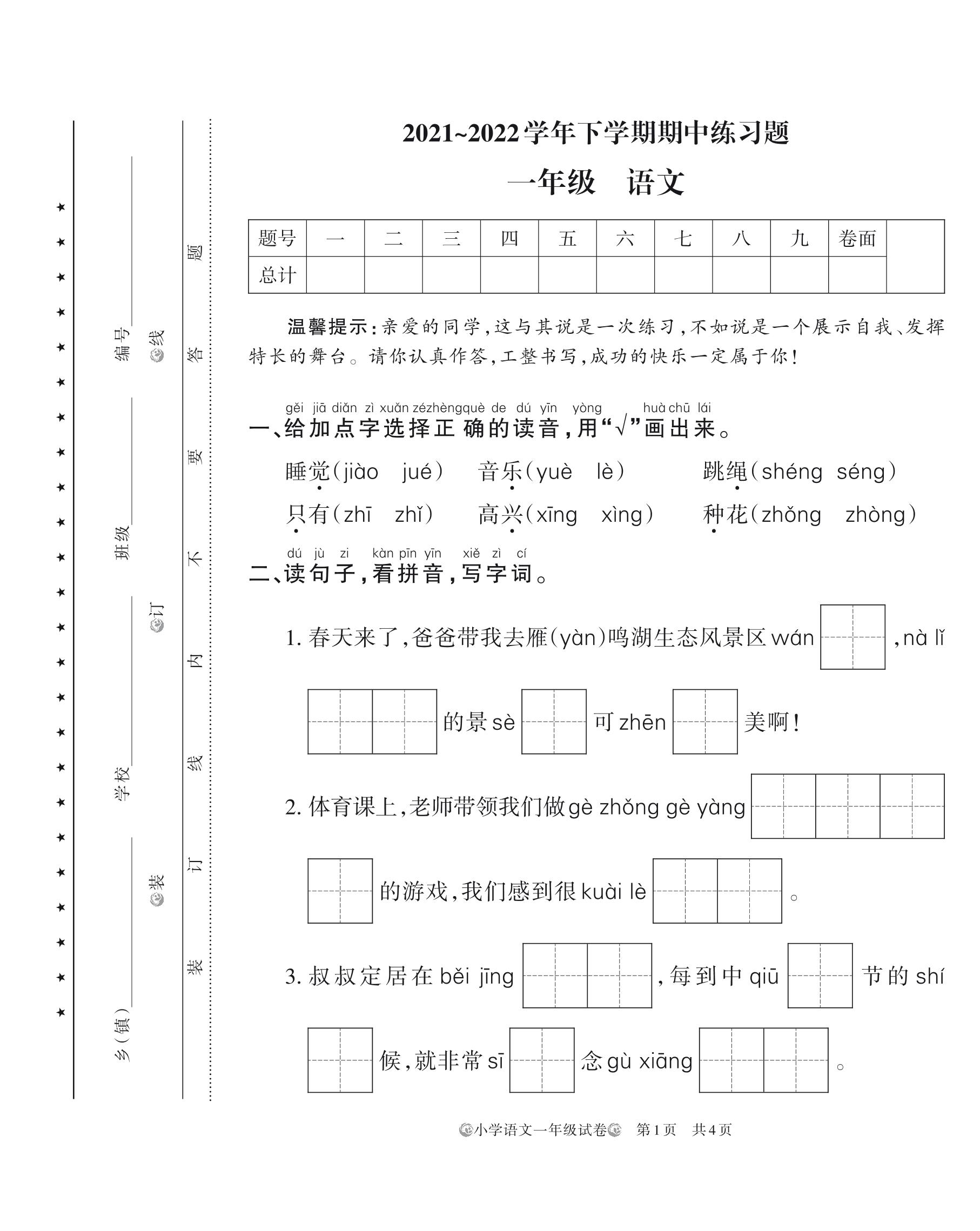 河南省郑州市中牟县姚家镇2021-2022学年下学期期中练习题一年级语文(人教版)