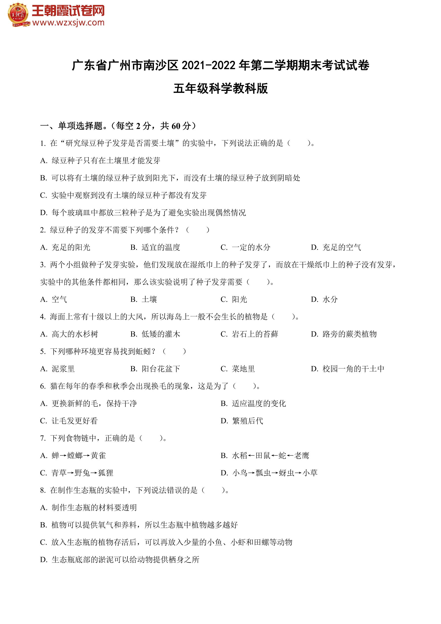 广东省广州市南沙区2021-2022年第二学期期末考试试卷五年级科学(教科版)