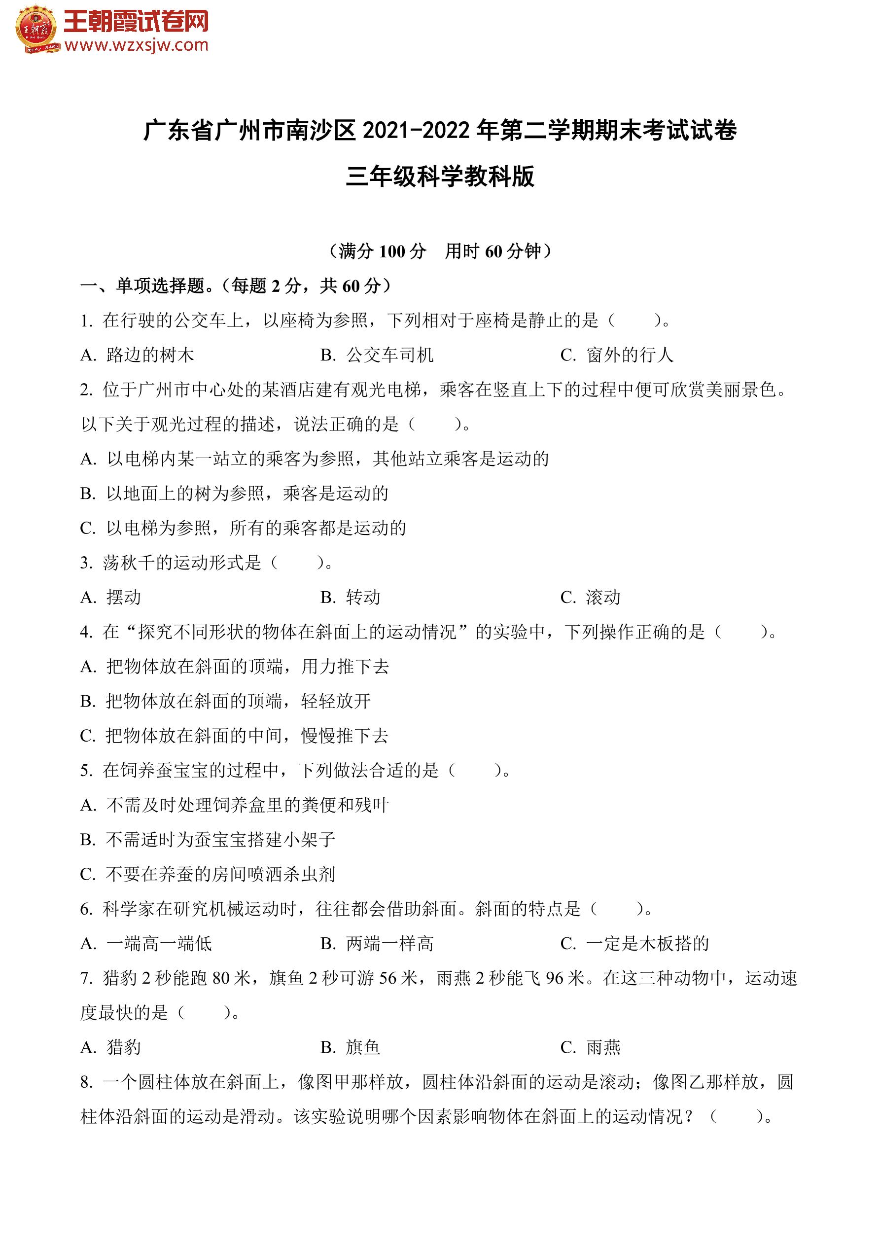 广东省广州市南沙区2021-2022年第二学期期末考试试卷三年级科学(教科版)