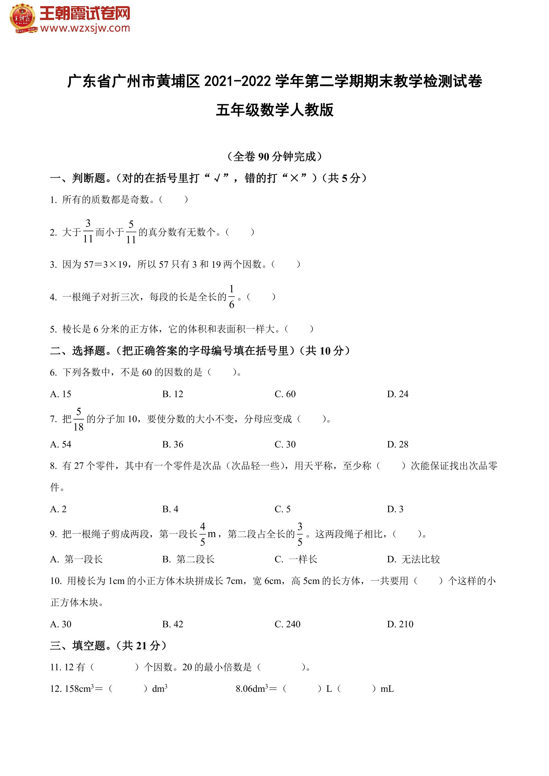 广东省广州市黄埔区2021-2022学年第二学期期末教学检测试卷五年级数学(人教版)