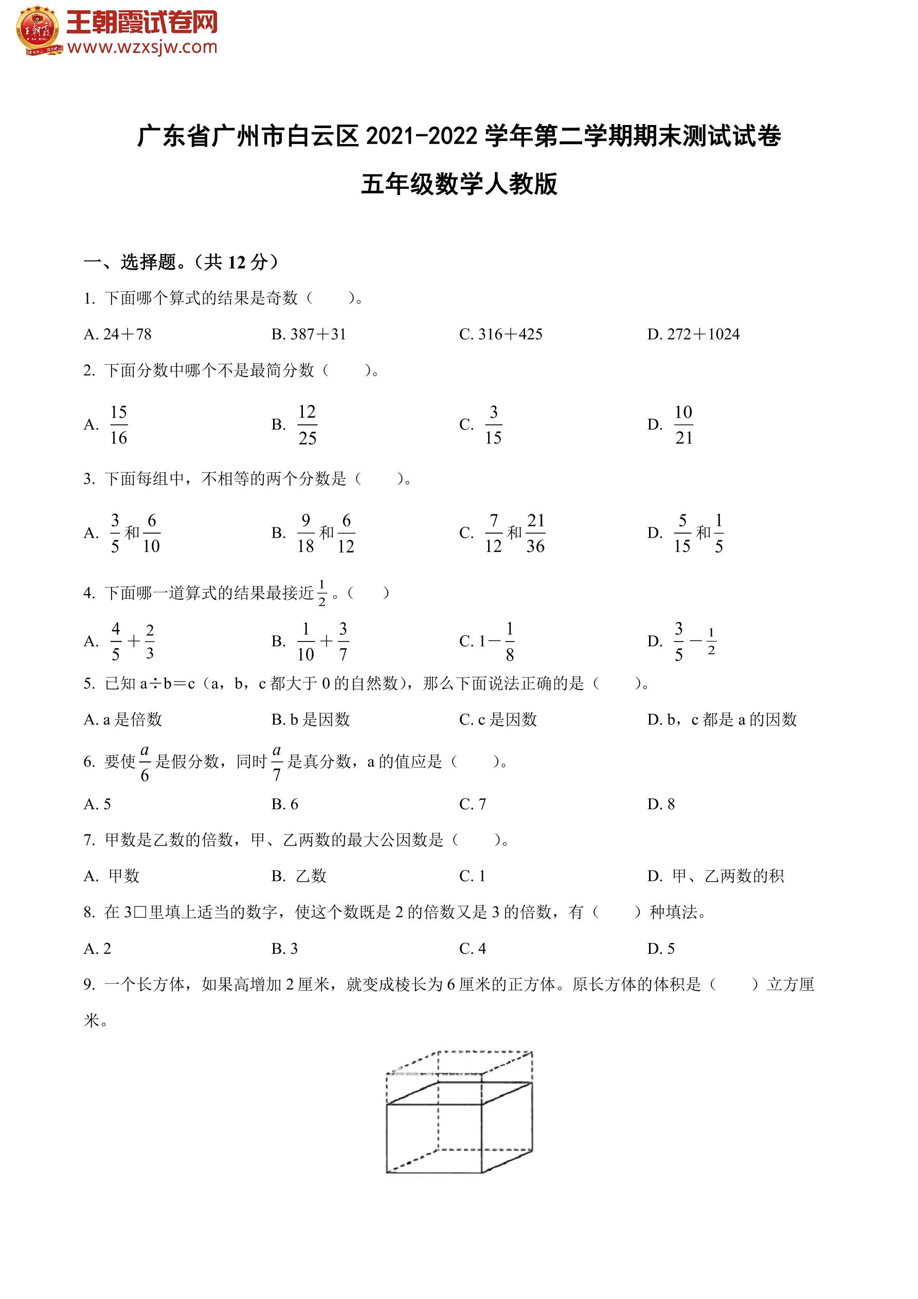广东省广州市白云区2021-2022学年第二学期期末测试试卷五年级数学(人教版)