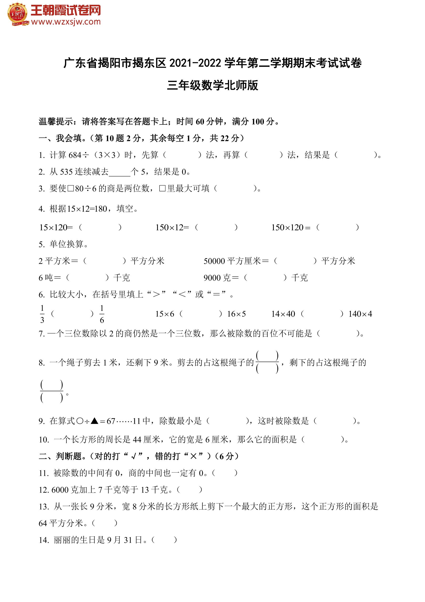 广东省揭阳市揭东区2021-2022学年第二学期期末考试试卷三年级数学(北师版)