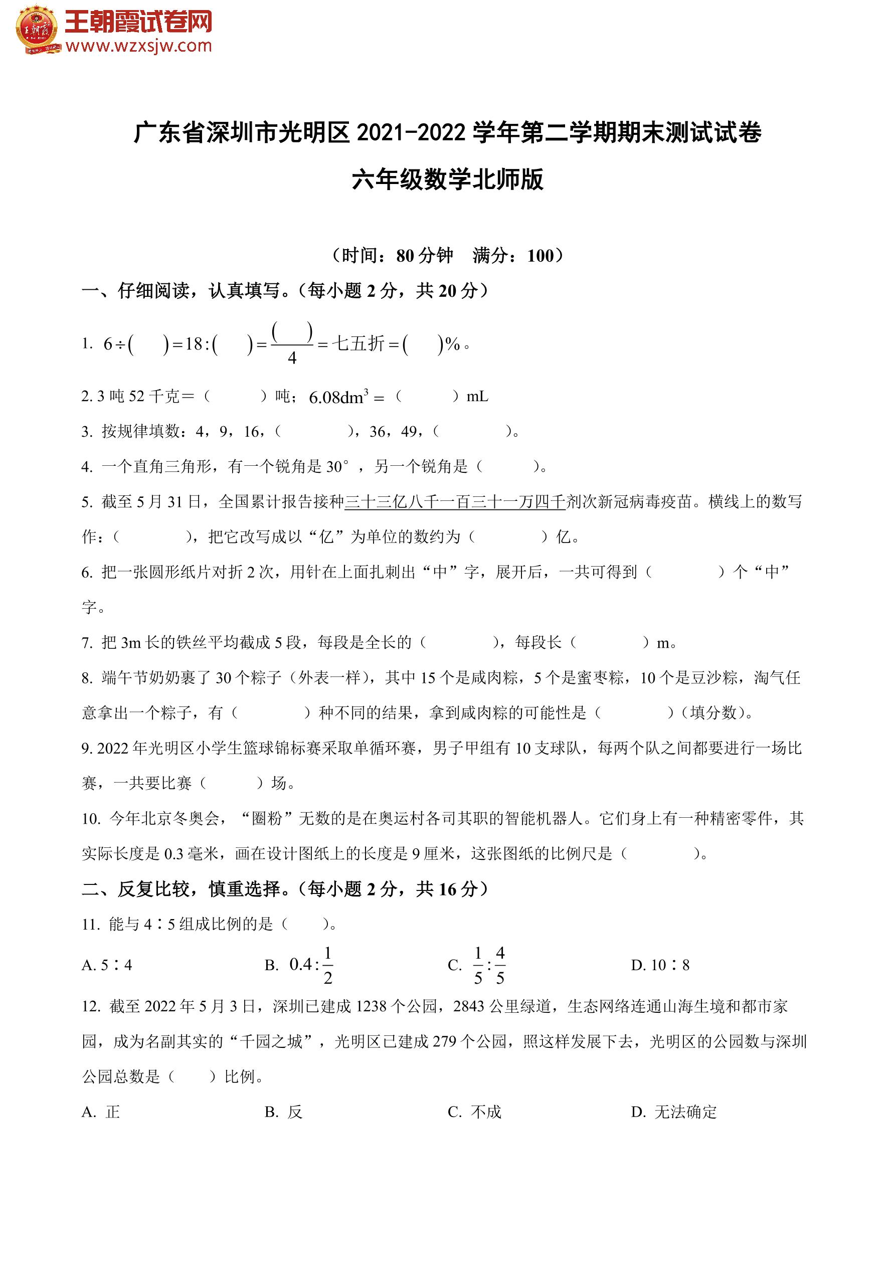 广东省深圳市光明区2021-2022学年第二学期期末测试试卷六年级数学(北师版)