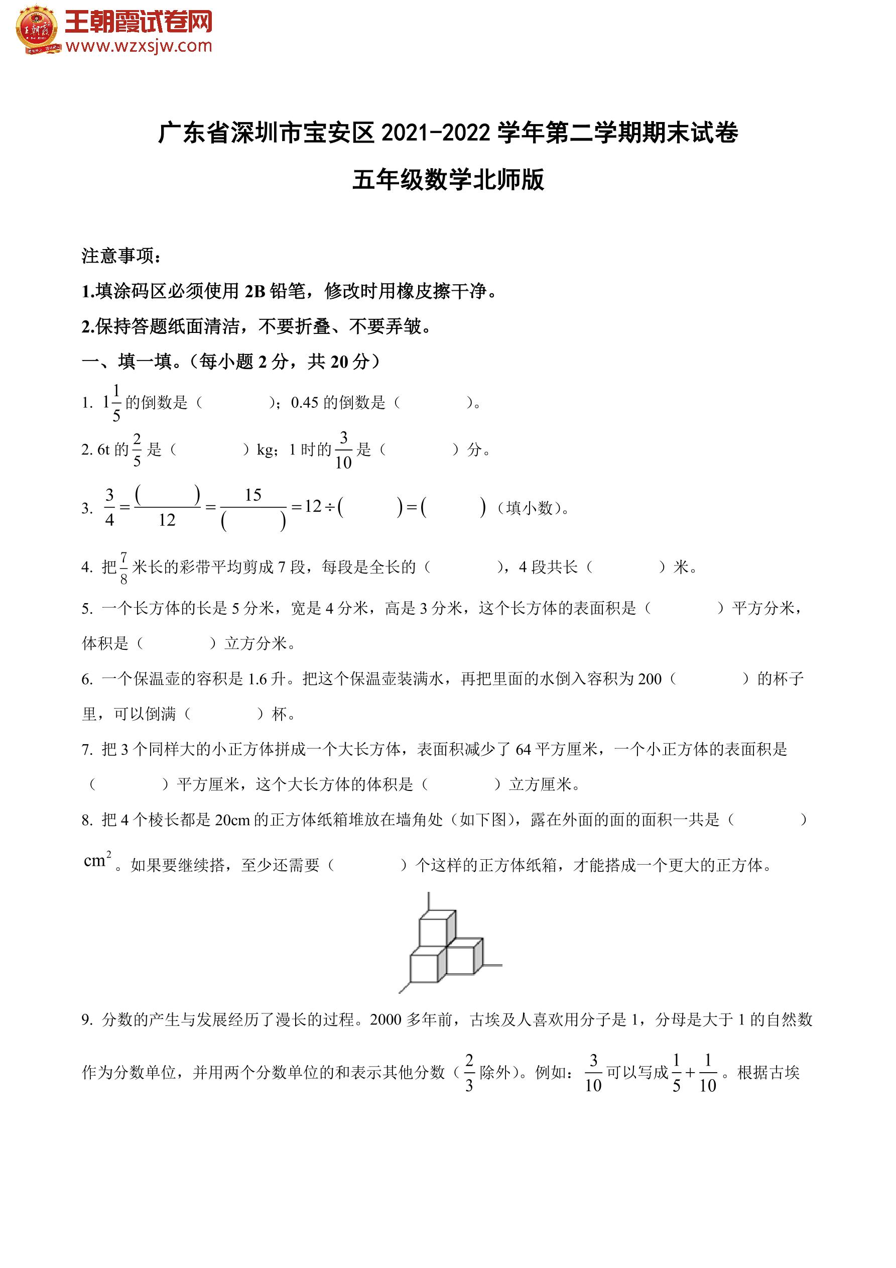 广东省深圳市宝安区2021-2022学年第二学期期末试卷五年级数学(北师版)