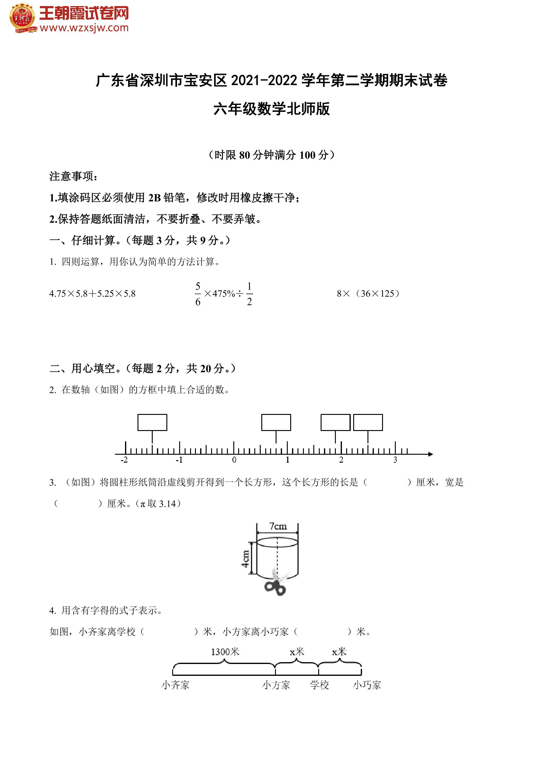 广东省深圳市宝安区2021-2022学年第二学期期末试卷六年级数学(北师版)