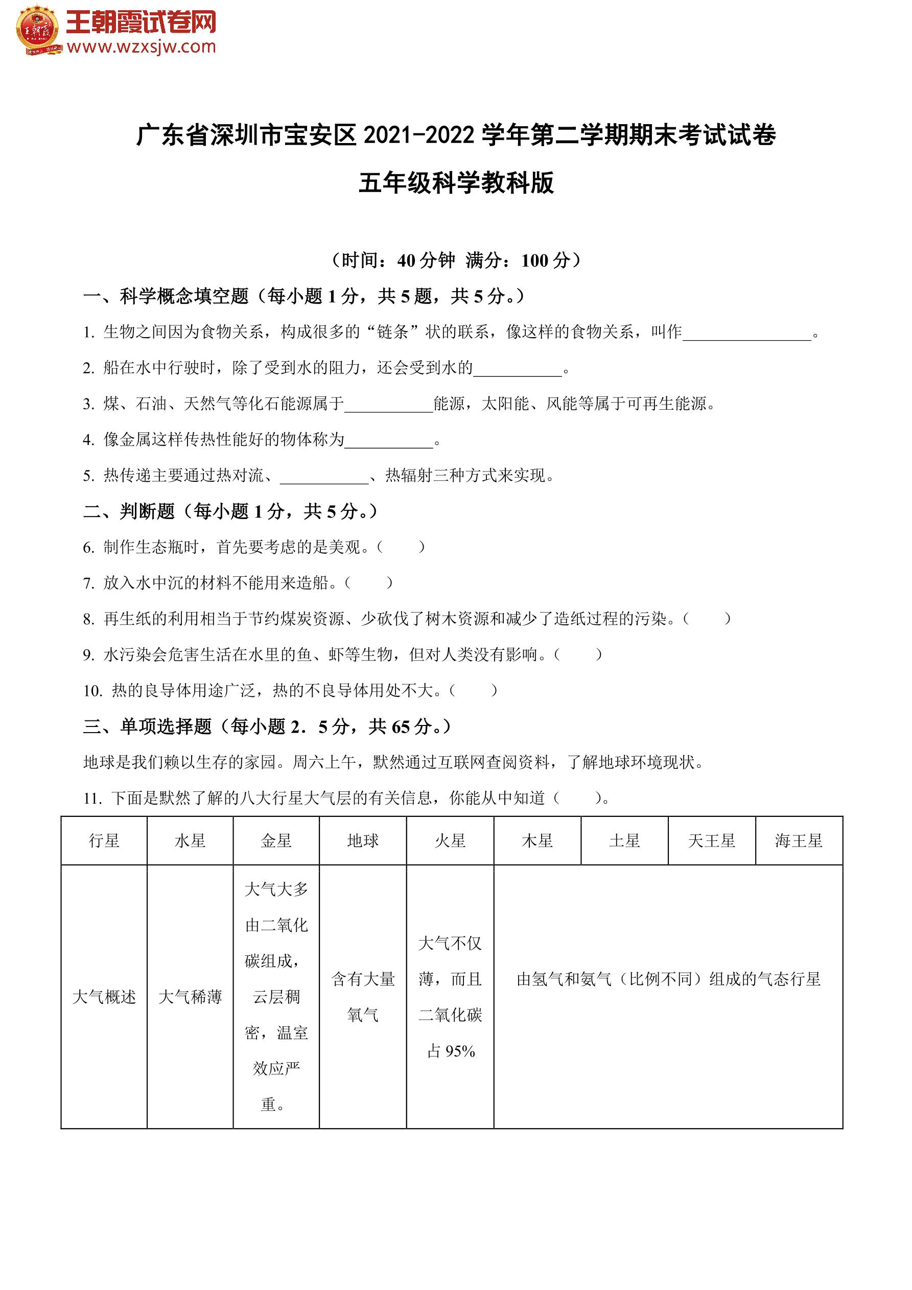 广东省深圳市宝安区2021-2022学年第二学期期末考试试卷五年级科学(教科版)