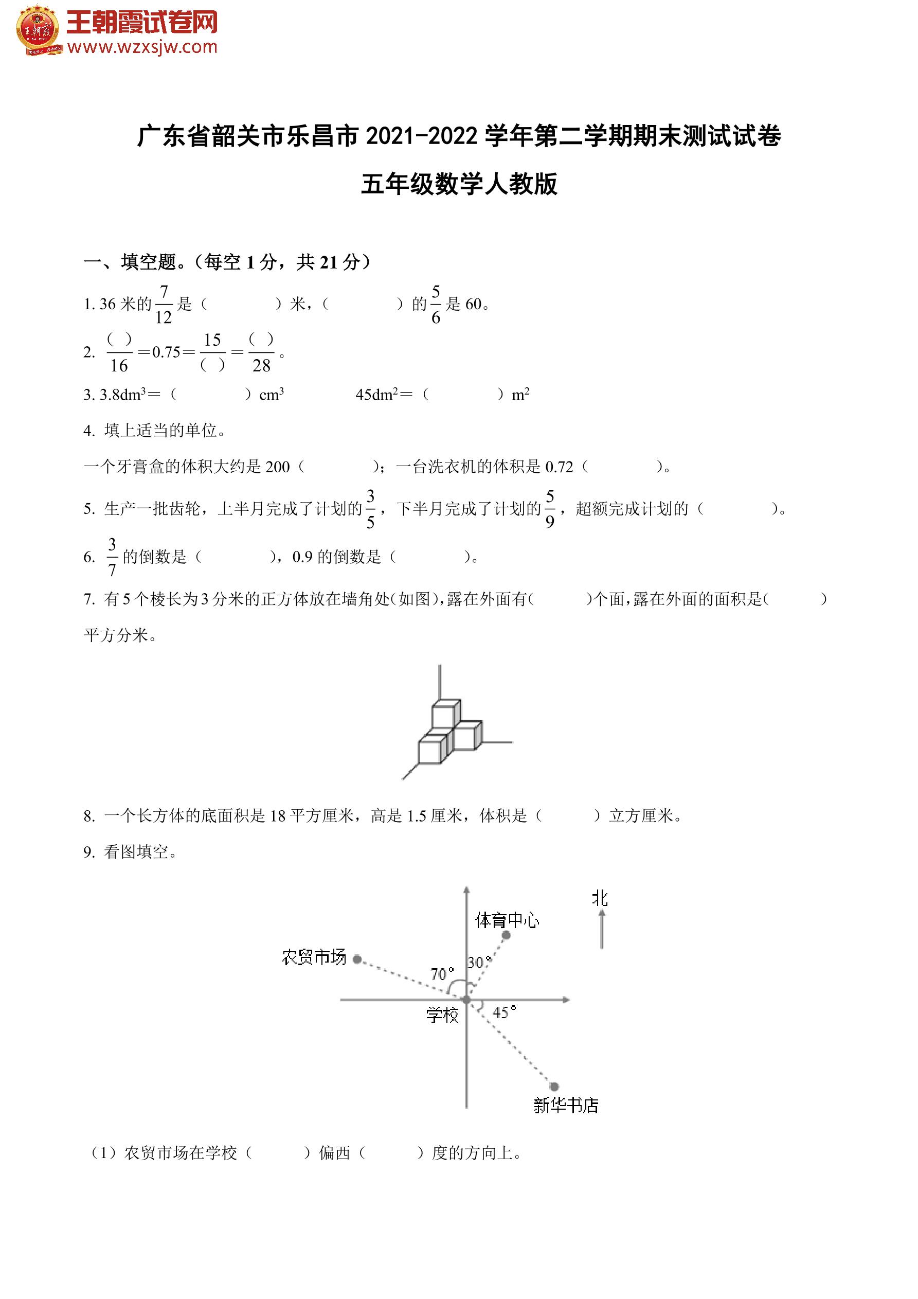广东省韶关市乐昌市2021-2022学年第二学期期末测试试卷五年级数学(人教版)