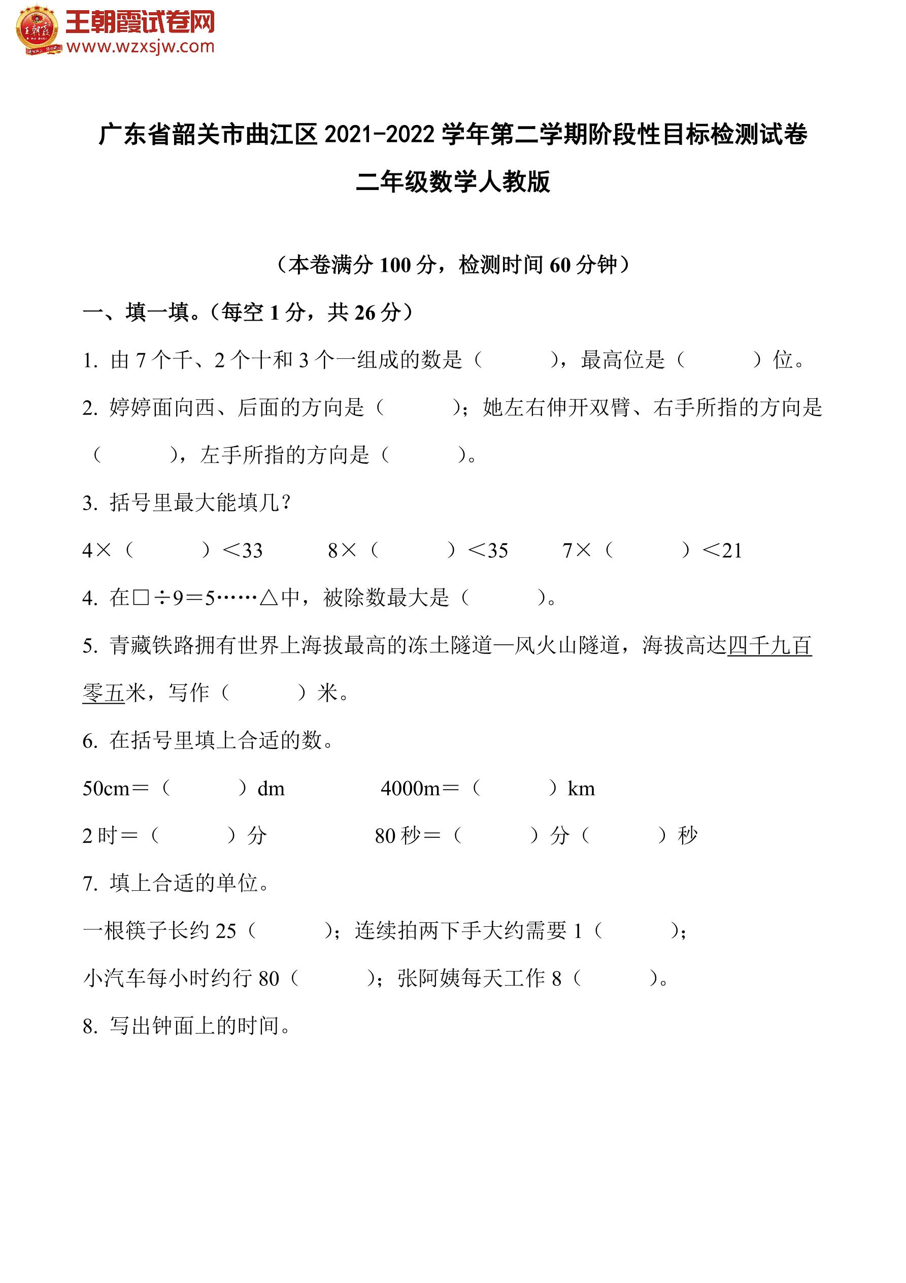 广东省韶关市曲江区2021-2022学年第二学期阶段性目标检测试卷二年级数学(人教版)