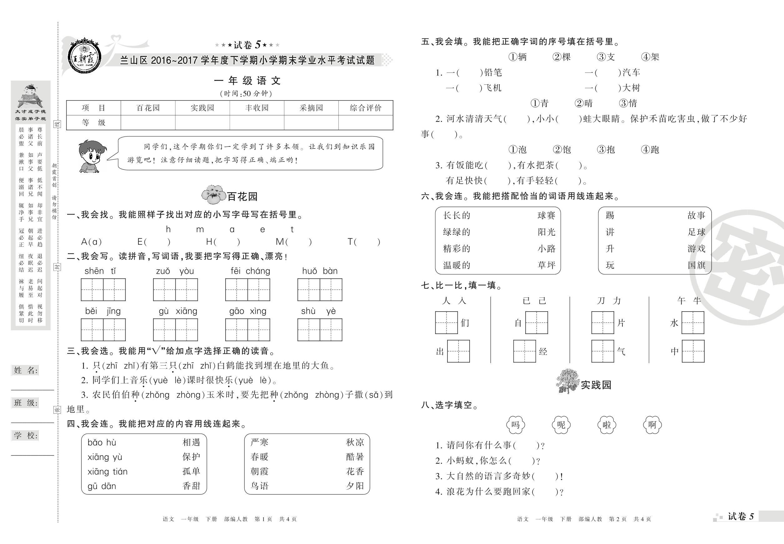 2016-2017学年第二学期临沂市兰山区一年级语文试卷(人教版)【5】