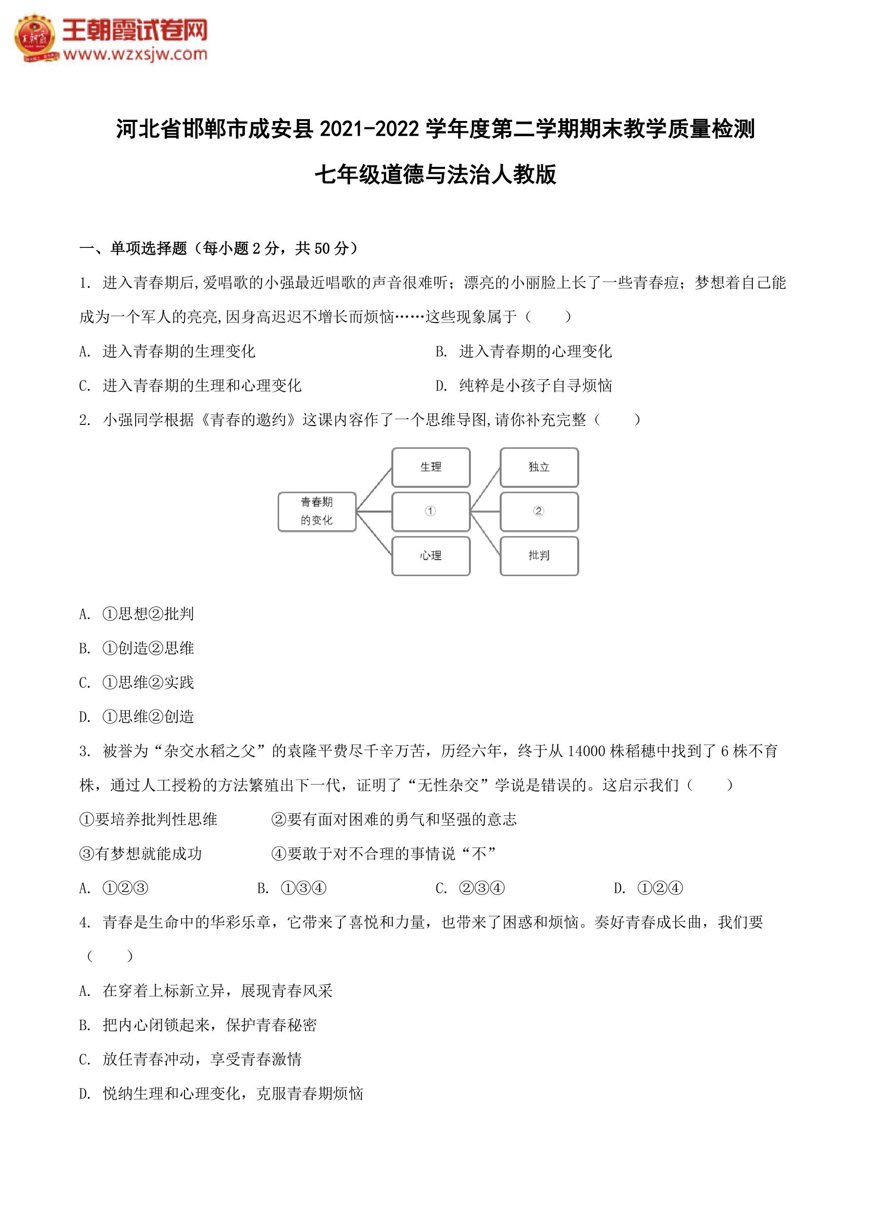 河北省邯郸市成安县2021-2022学年度第二学期期末教学质量检测七年级道德与法治(人教版)