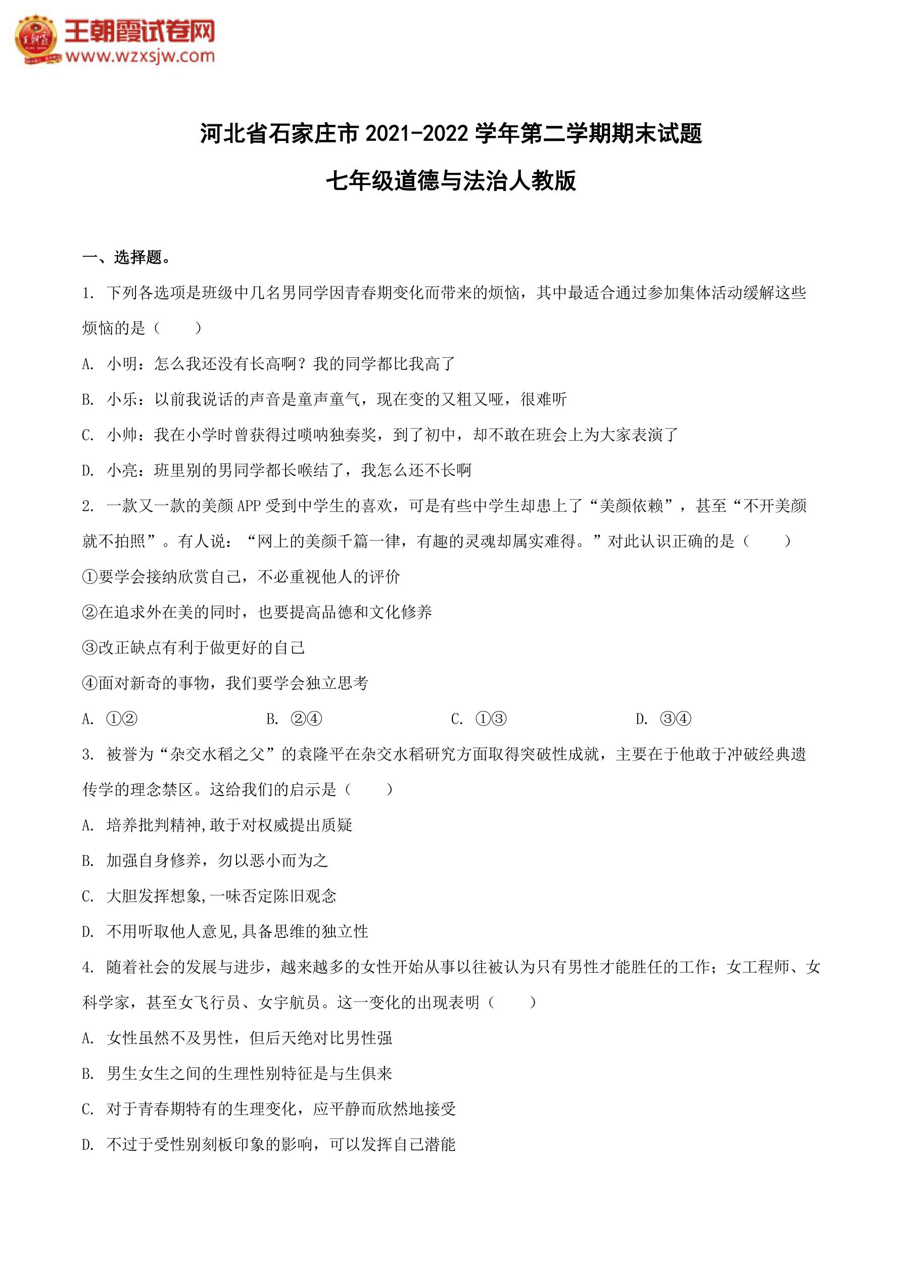 河北省石家庄市2021-2022学年度第二学期期末试题七年级道德与法治(人教版)