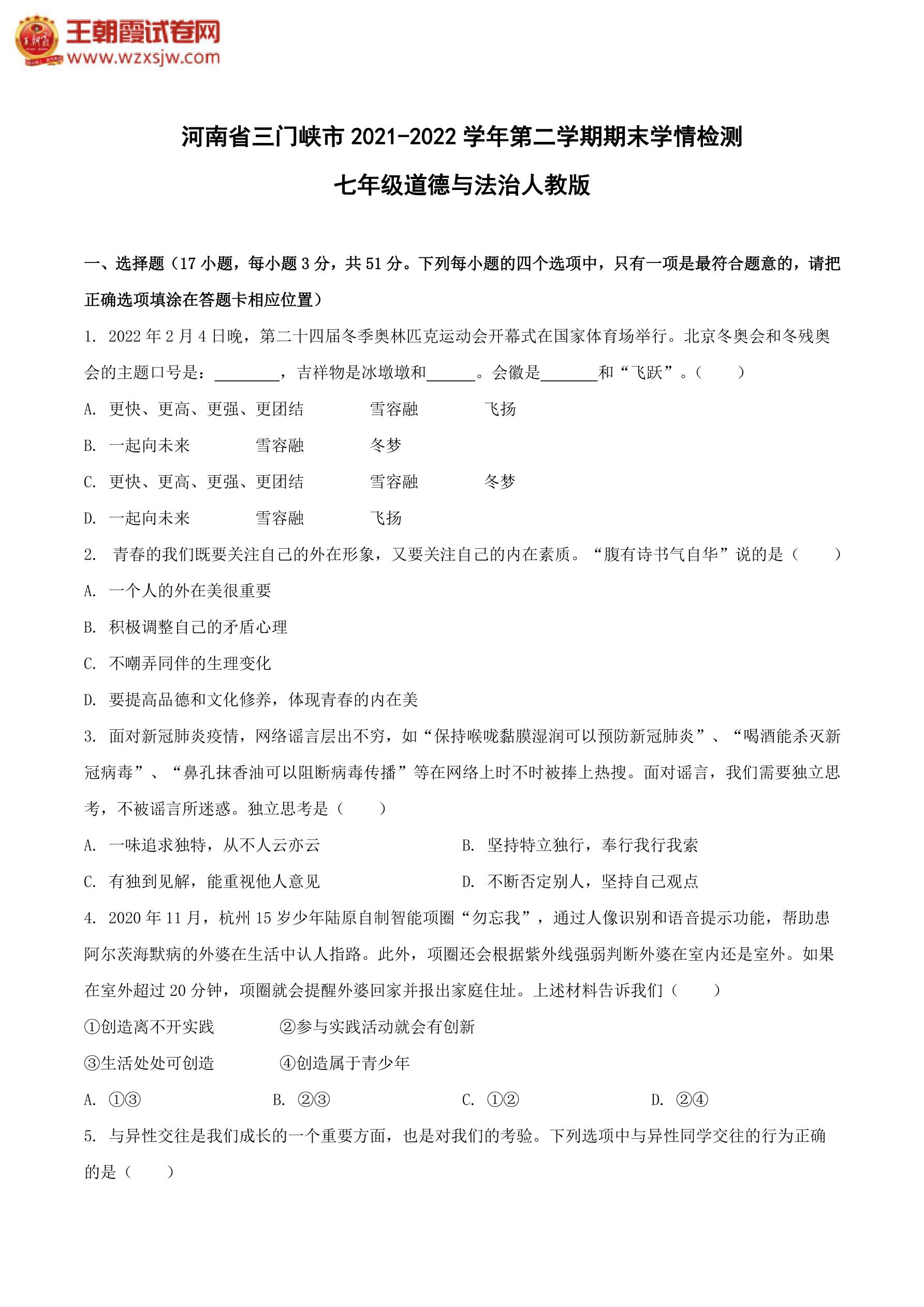 河南省三门峡市2021-2022学年第二学期期末学期检测七年级道德与法治(人教版)