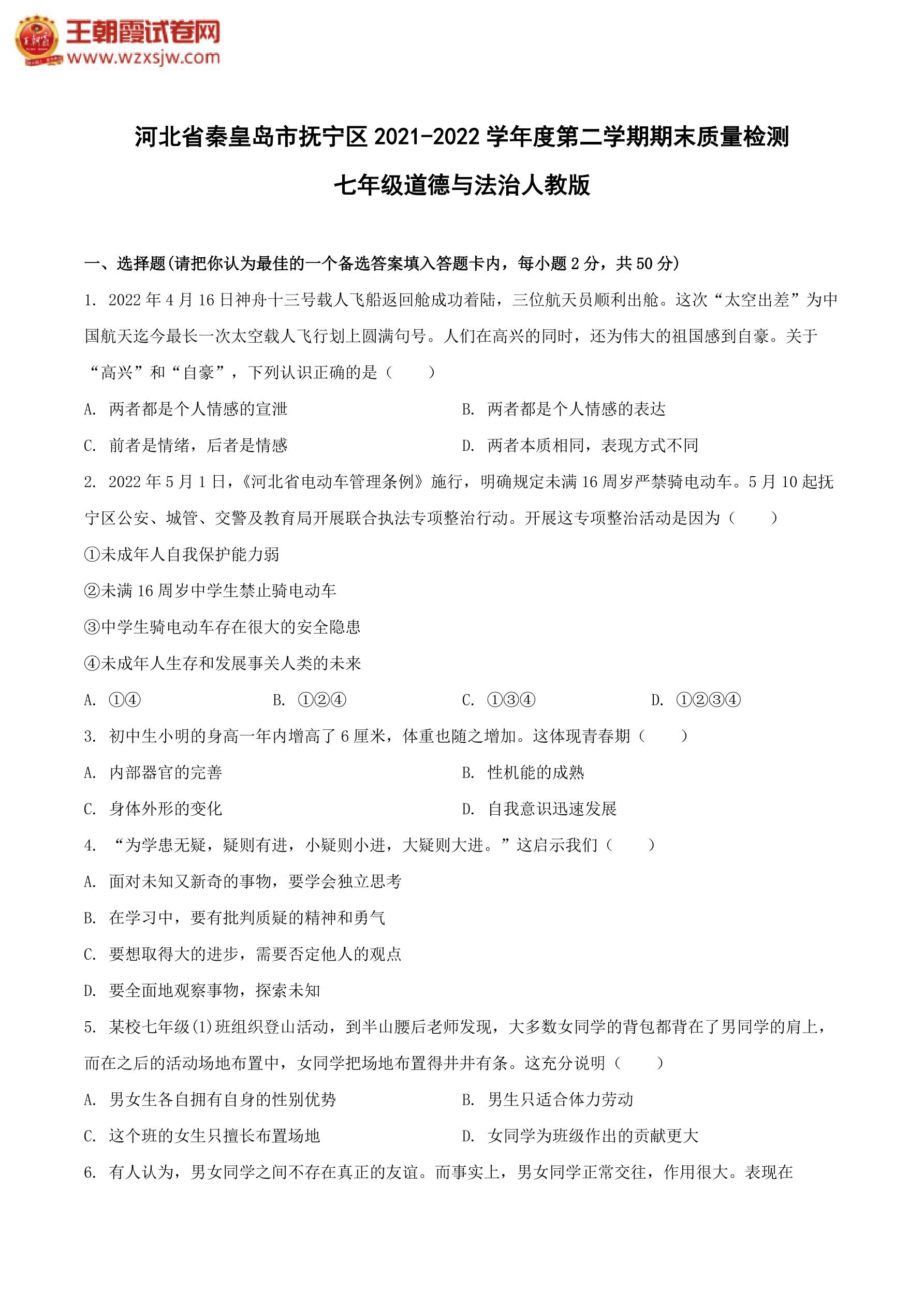 河北省秦皇岛市抚宁区2021-2022学年度第二学期期末质量检测七年级道德与法治(人教版)