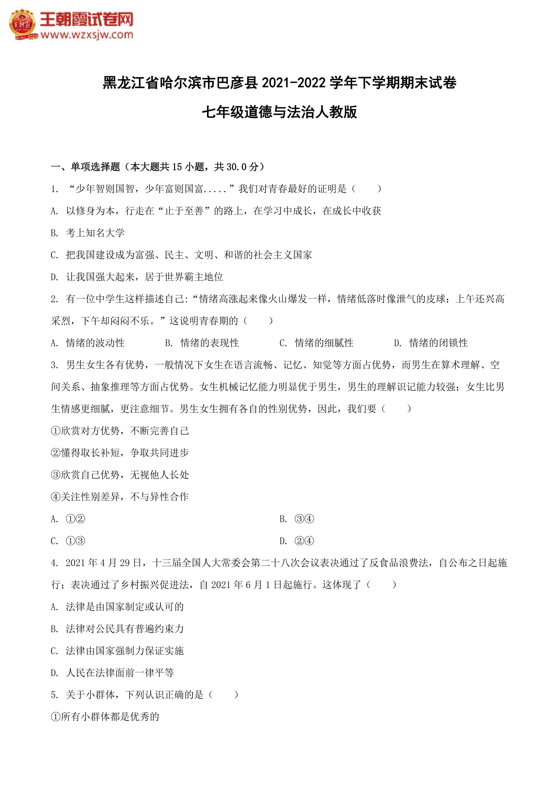 黑龙江省哈尔滨市巴彦县2021-2022学年下学期期末试卷七年级道德与法治(人教版)