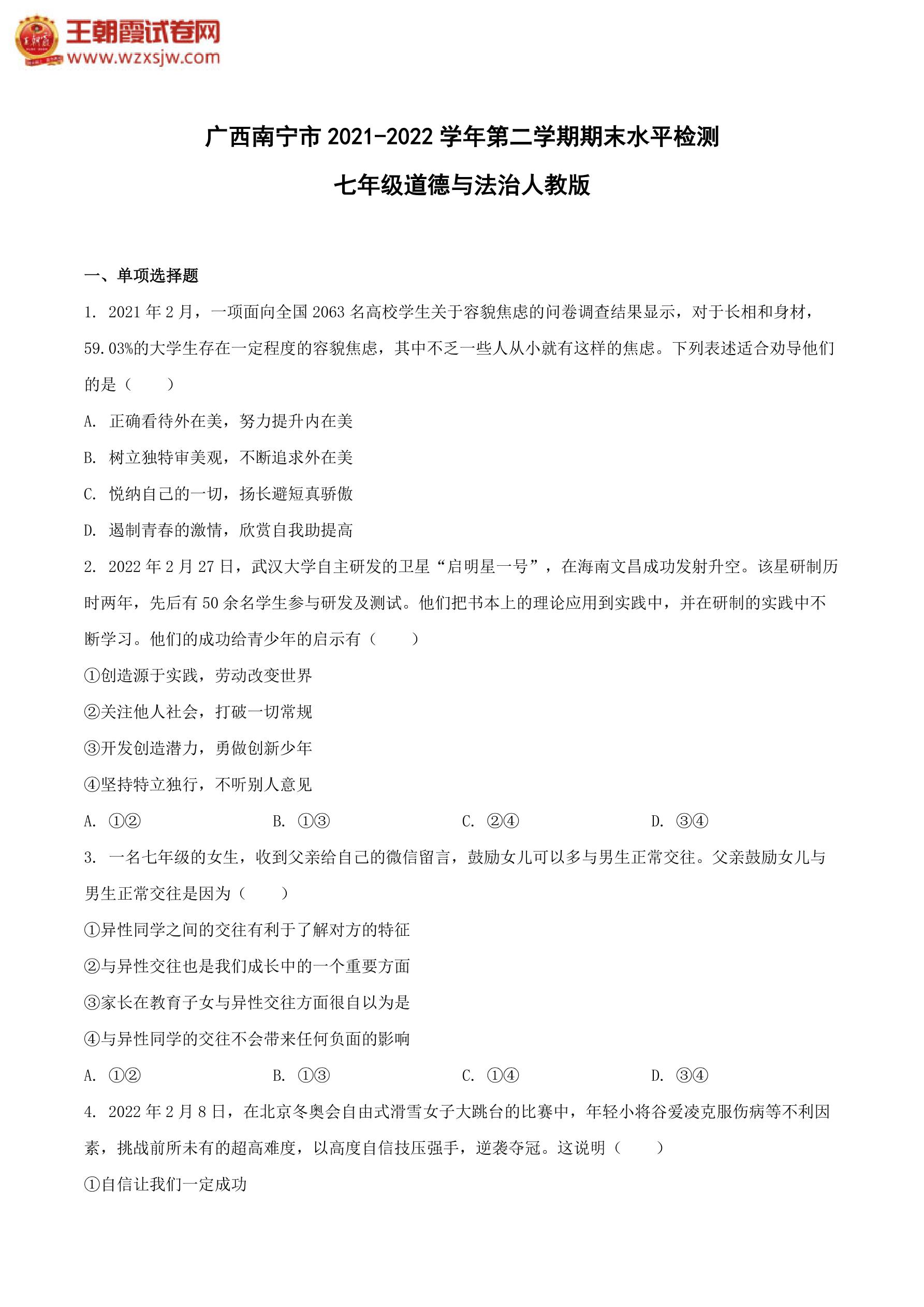 广西南宁市 2021-2022学年第二学期期末水平检测七年级道德与法治(人教版)