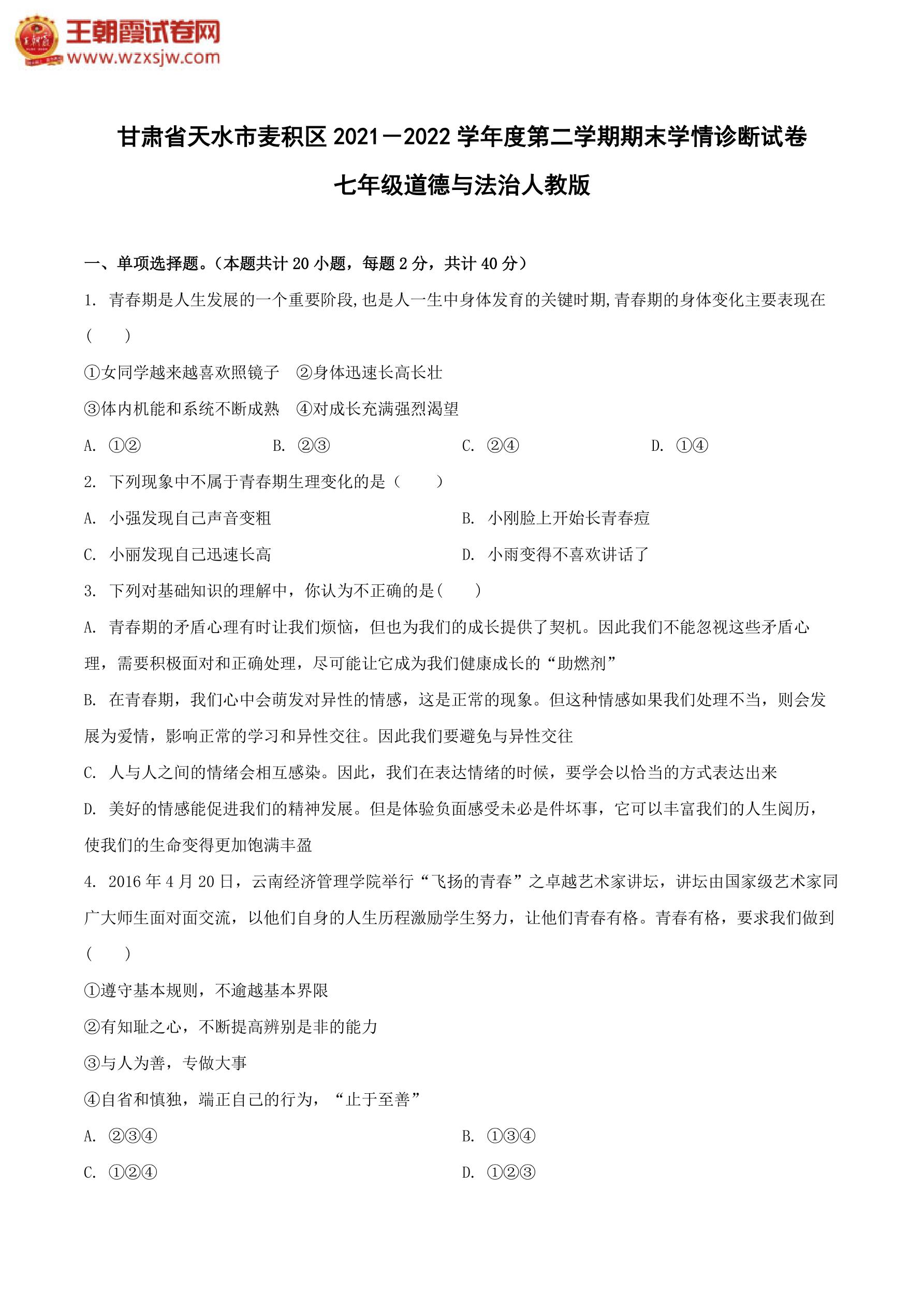 甘肃省天水市麦积区2021-2022学年度第二学期期末学情诊断试卷七年级道德与法治(人教版)