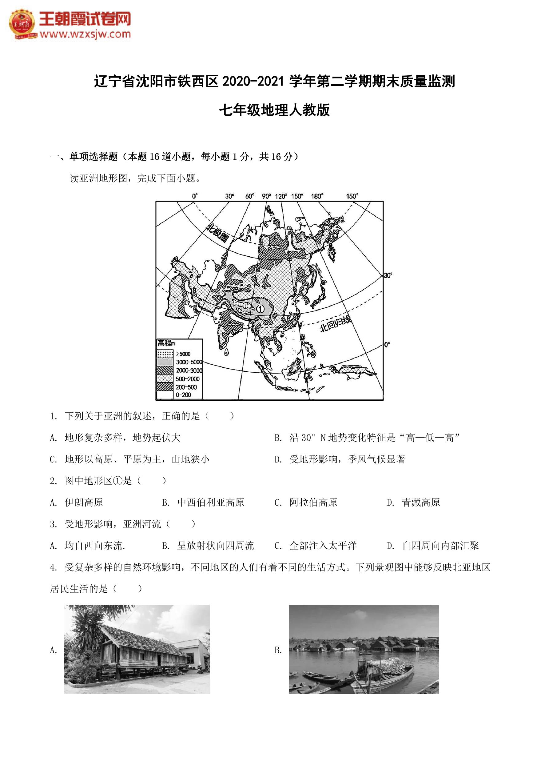 辽宁省沈阳市铁西区2020-2021学年第二学期期末质量监测七年级地理(人教版)