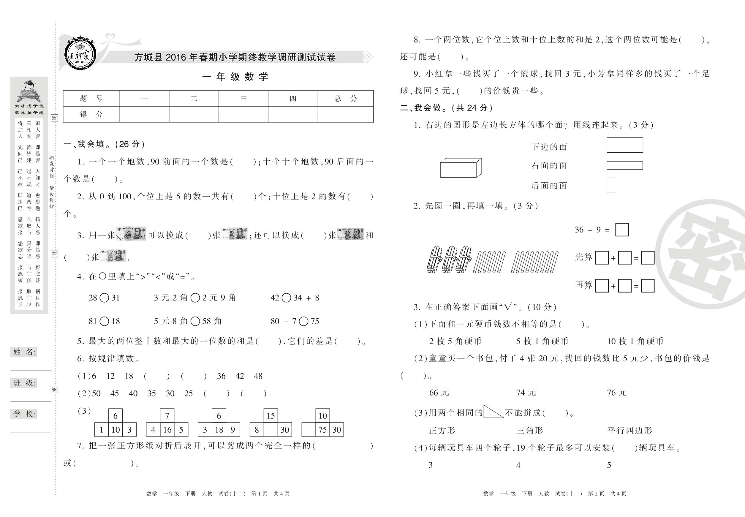 2015-2016学年第二学期南阳市社旗县一年级数学试卷(人教版)【12】