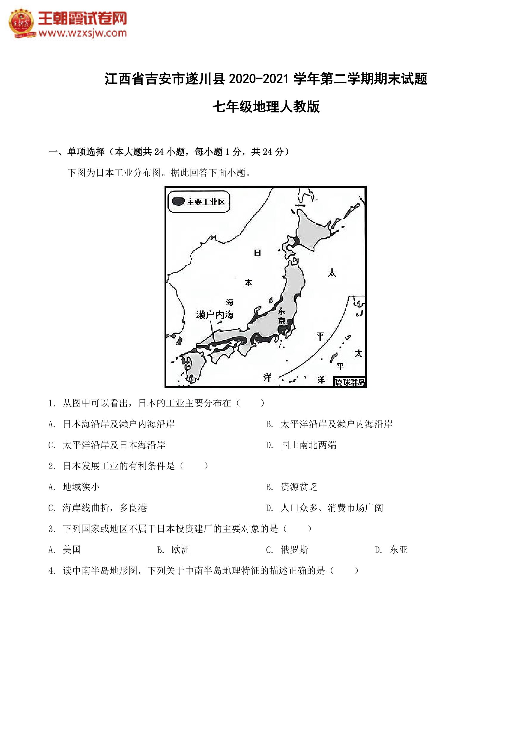 江西省吉安市遂川县2020-2021学年第二学期期末试题七年级地理(人教版)