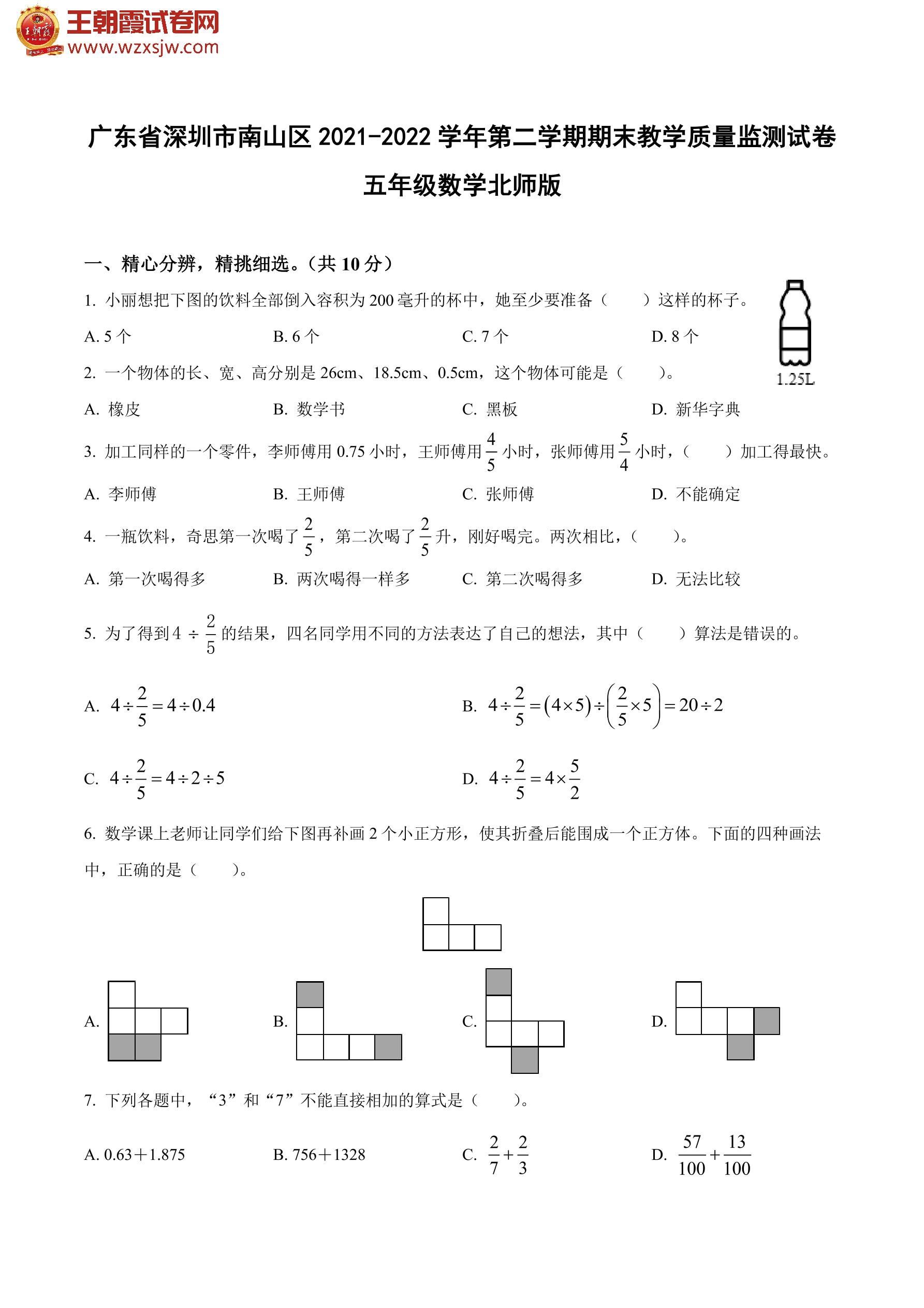 广东省深圳市南山区2021-2022学年第二学期期末教学质量监测试卷五年级数学(北师版)