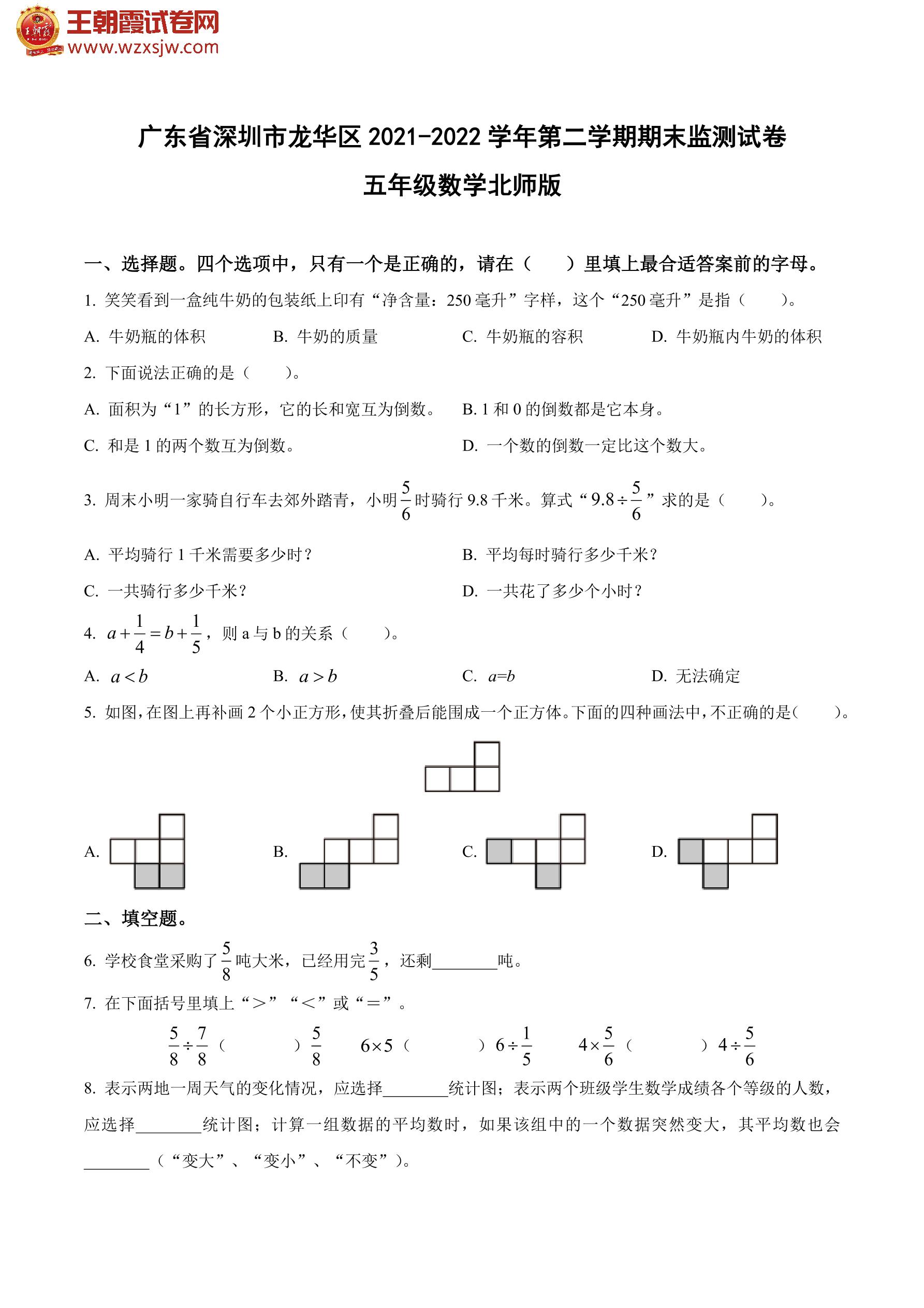 广东省深圳市龙华区2021-2022学年第二学期期末监测试卷五年级数学(北师版)