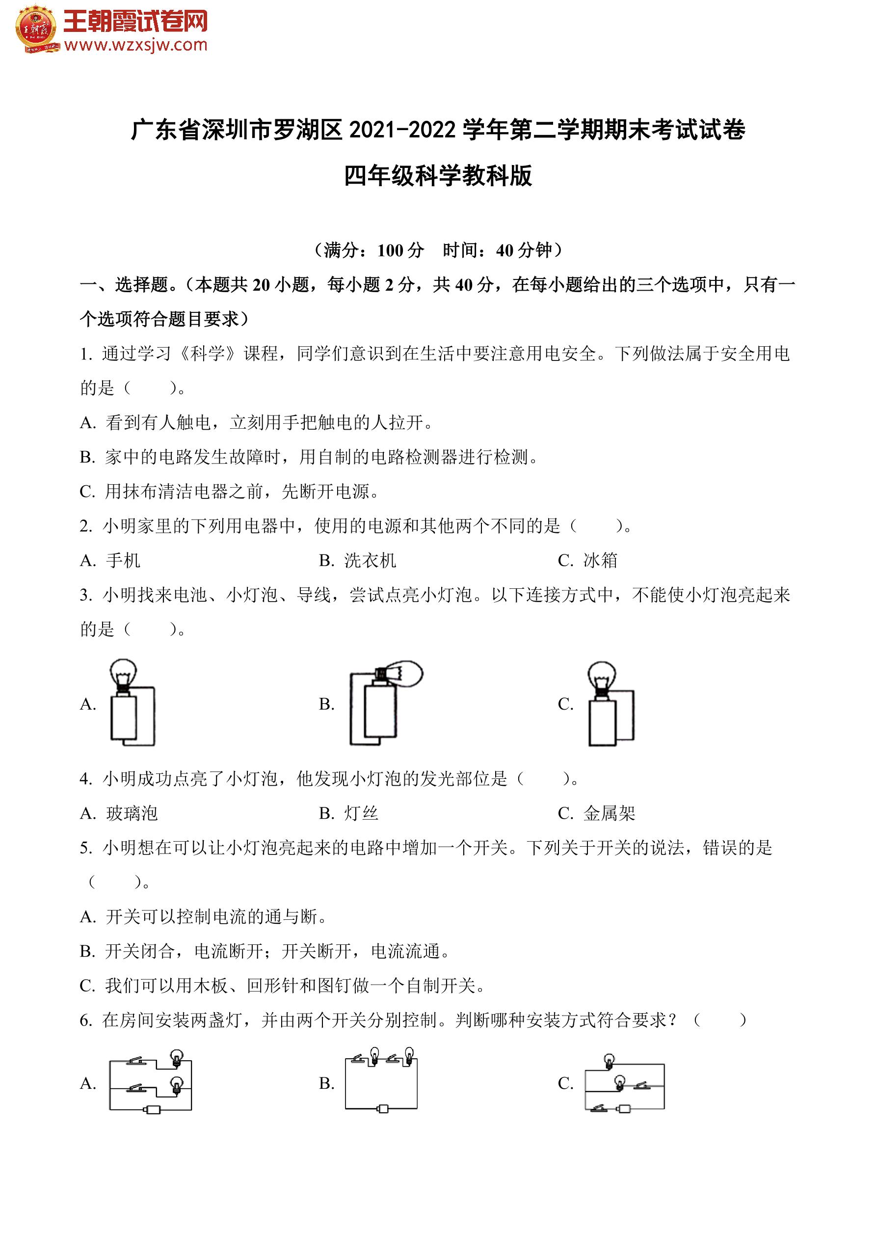 广东省深圳市罗湖区2021-2022学年第二学期期末考试试卷四年级科学(教科版)