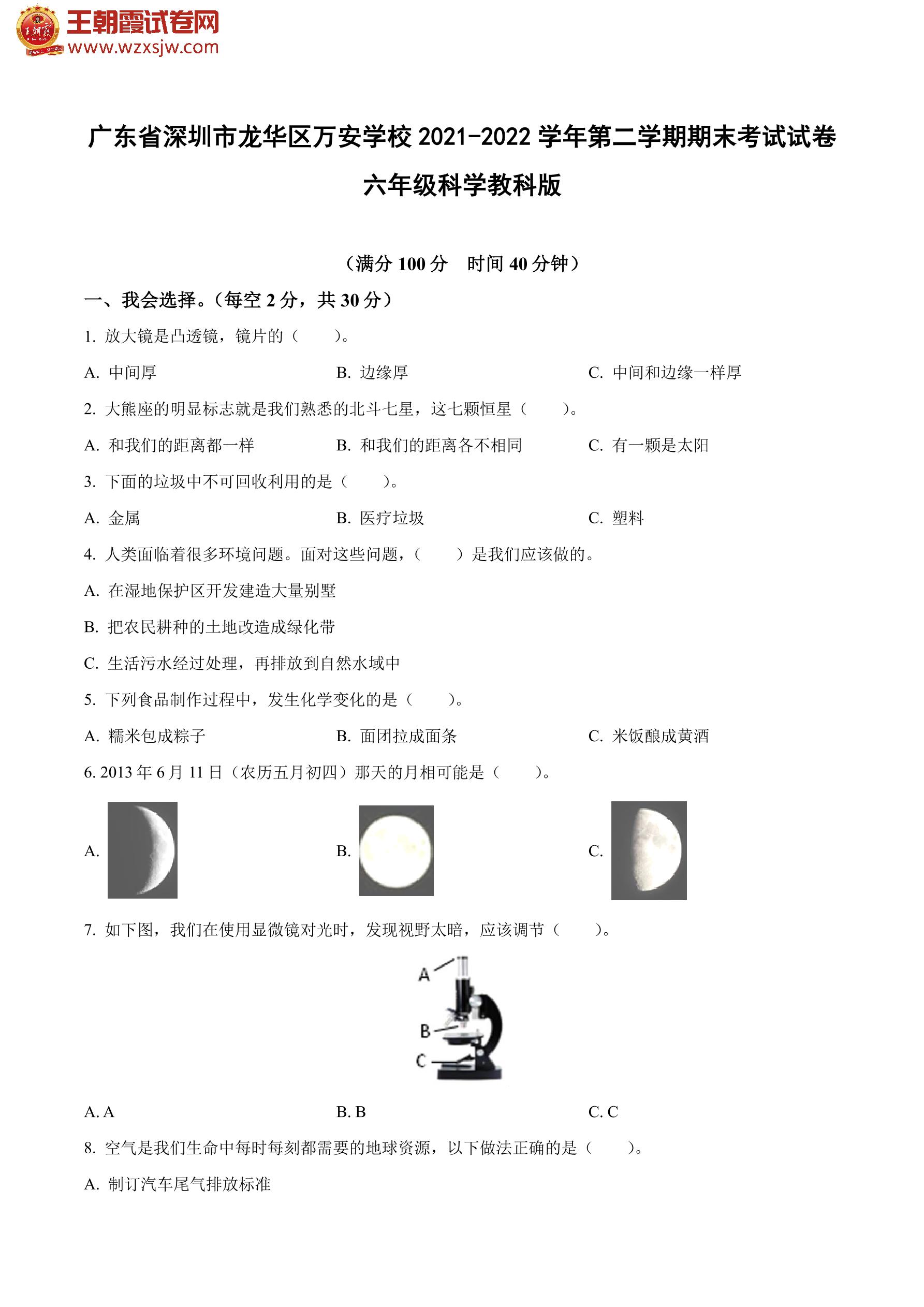 广东省深圳市龙华区万安学校2021-2022学年第二学期期末考试试卷六年级科学(教科版)